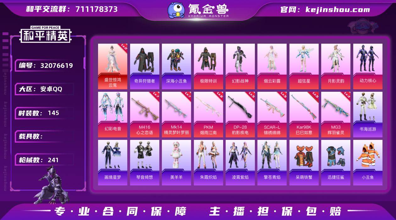 【特价出售/店主推荐】安卓 手Q-1神装-7粉装-10特效枪-0载具-8粉色飞行器-74776热力值-11王牌印记-145套装-241枪皮 【红色神装等级】:盛世惊鸿-云鸾(二级) 【红色角色神装】:盛世惊鸿-云鸾 【热门品类】:套装-深海小丑鱼,套装-小丑鱼,套装-奇异狩猎者,套装-龟仙人,角色-Mark.06 【粉色套装】:粉装-极限特训,粉装-幻影战神,角色-烟云彩露,角色-超弦星,角色-月影灵韵,粉装-动力核心,粉装-幻彩电音 【粉色枪皮等级】:SCAR-L-锦绣绵绵(五级),M416-心之恋语(七级),UMP45-萌骑冒险(一级),AKS-74U-森灵之息(五级),Kar98K-巳巳如意(五级),Mk14-精灵梦叶罗丽(七级),Mk14-福马献瑞(五级),DP-28-豹影疾电(五级),MG3-辉羽雀灵(三级),PKM-江南烟雨(六级) 【粉色枪皮】:SCAR-L-锦绣绵绵,M416-心之恋语,UMP45-萌骑冒险,AKS-74U-森灵之息,Kar98K-巳巳如意,Mk14-精灵梦叶罗丽,Mk14-福马献瑞,DP-28-豹影疾电,MG3-辉羽雀灵,PKM-江南烟雨 【粉色飞行器】:炫彩糖果飞行器,星之彼岸飞行器,沙丘之主天马,繁龙极客飞行器,霓虹漫游飞行器,幽焰列车飞行器,灵猫魔法师飞行器,暮色之舞飞行器 【粉色降落伞】:幻影战神降落伞,星之彼岸降落伞,星夜魔法师降落伞,千面幻镜降落伞,萌物绒绒降落伞,蜜语绒猫降落伞,鎏金朋克降落伞,江南烟雨降落伞,巴啦啦小魔仙降落伞,霓虹漫游降落伞,精灵梦叶罗丽降落伞,墨龙九天降落伞,冠军兔兔降落伞,宇宙意志降落伞,临安公主降落伞,金蛇镇世降落伞,月下星之子降落伞,星穹咏叹调降落伞,幻彩电音降落伞,冷漠罗丽降落伞,荧海星豚降落伞,喜羊羊与灰太狼降落伞,异瞳寒姬降落伞,炫彩糖果降落伞 【稀有套装】:套装-龟仙人,套装-炽纹蛇影,套装-巳巳如意,套装-雪国风尚,套装-炫彩糖果,套装-马上来财,套装-雏菊兔兔,套装-萝兰蝴蝶,套装-小熊娃娃...