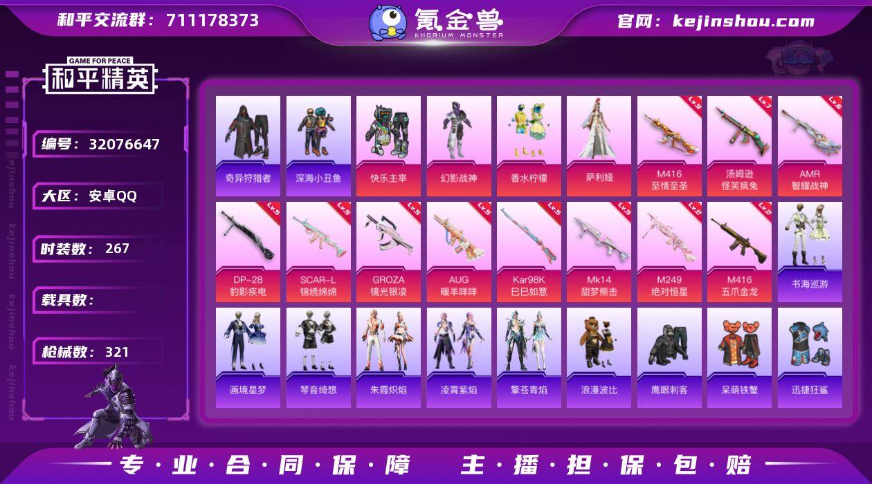 【特价出售/店主推荐】安卓 手Q-4粉装-14特效枪-0载具-2粉色飞行器-103755热力值-17王牌印记-267套装-321枪皮 【热门品类】:套装-浪漫天命,套装-深海小丑鱼,套装-小丑鱼,套装-奇异狩猎者,套装-金羽特工,套装-龟仙人,套装-暗影哥特,套装-浪漫波比,套装-粉红小猪,熔岩游骑兵连帽夹克 【粉色套装】:粉装-快乐主宰,粉装-幻影战神,粉装-香水柠檬,角色-萨利娅 【粉色枪皮等级】:SCAR-L-锦绣绵绵(五级),M416-五爪金龙(二级),M416-至情至圣(九级),GROZA-镜光银凌(五级),AUG-暖羊咩咩(五级),汤姆逊-怪笑疯兔(七级),AKS-74U-森灵之息(五级),Kar98K-巳巳如意(五级),Mk14-甜梦熊击(五级),Mk14-福马献瑞(五级),AMR-智耀战神(六级),AA12-G-萌骑幻想(四级),M249-绝对恒星(二级),DP-28-豹影疾电(五级) 【粉色枪皮】:SCAR-L-锦绣绵绵,M416-五爪金龙,M416-至情至圣,GROZA-镜光银凌,AUG-暖羊咩咩,汤姆逊-怪笑疯兔,AKS-74U-森灵之息,Kar98K-巳巳如意,Mk14-甜梦熊击,Mk14-福马献瑞,AMR-智耀战神,AA12-G-萌骑幻想,M249-绝对恒星,DP-28-豹影疾电 【粉色飞行器】:炫彩糖果飞行器,炫紫旋律飞行器 【粉色降落伞】:极限特训降落伞,快乐主宰降落伞,春暖花开降落伞,梦幻火箭降落伞,炫紫旋律降落伞,四圣焕新降落伞,心之恋语降落伞,梦之光华降落伞,海渊国主降落伞,恐龙拽拽降落伞,环太平洋降落伞,垂柳戏鸭降落伞,暗夜鎏金降落伞,拂晓神骑降落伞,临安公主降落伞,月影灵韵降落伞,星穹咏叹调降落伞,无垠阁降落伞,炫彩糖果降落伞 【稀有套装】:套装-龟仙人,套装-巳巳如意,套装-雪国风尚,套装-炫彩糖果,角色-罗莉,套装-马上有钱,角色-米开朗基罗,套装-燕燕于飞,套装-鱼渊荷华,玩偶服-小狗蛇点点,角色-绛羽幽主,套装-朱霞炽焰,套装-凌霄紫焰,套装-擎苍青焰,套装-书海巡...