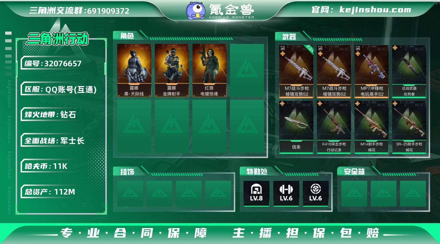 【特价出售/店主推荐】112m总资产-11k哈伏币-60烽火等级-钻石-27战场等级-军士长 【热门藏品】:非洲之心 【干员外观】:露娜-黑·天际线,红狼-电锯惊魂,露娜-金牌射手 【近战皮肤】:近战-信条,近战-处刑者1级,近战-黑鹰 【典藏外观】:M7战斗步枪-棱镜攻势S2,MP7冲锋枪-电玩高手S2 【典藏外观成色】:M7战斗步枪-棱镜攻势S2(优品B),MP7冲锋枪-电玩高手S2(优品A) 【传说外观】:M4A1突击步枪-阿米娅,ASh-12战斗步枪-鹅鸭杀,K416突击步枪-行动记录,M16A4突击步枪-狩猎时刻,SG552突击步枪-运动员,SCAR-H战斗步枪-水墨云图,SCAR-H战斗步枪-启航,G3战斗步枪-狩猎时刻,G3战斗步枪-骑士,CAR-15突击步枪-阿米娅,腾龙突击步枪-捞点薯条,P90冲锋枪-信条,Vector冲锋枪-狩猎时刻,勇士冲锋枪-能天使-午夜邮差,QCQ171冲锋枪-鹅鸭杀,M250通用机枪-骑士之心,QJB201轻机枪-鹅鸭杀,M14射手步枪-蛮荒,M14射手步枪-缄花,SKS射手步枪-骑士,SR-25射手步枪-信条,SR-25射手步枪-缄花,AWM狙击步枪-捞点薯条,.357左轮-缄花,93R-捞点薯条,复合弓-黑·天际线 【史诗外观】:AKM突击步枪-林中猎手,ASh-12战斗步枪-无极限,K416突击步枪-阿萨拉特攻,M16A4突击步枪-竞赛选手,M7战斗步枪-百步穿杨,SG552突击步枪-哈夫克警备,G3战斗步枪-流沙送葬,G3战斗步枪-哈夫克警备,AS Val突击步枪-百步穿杨,K437突击步枪-守护者,MP5冲锋枪-战术竞备,MP5冲锋枪-竞技风,Vector冲锋枪-阿萨拉文明,Vector冲锋枪-百步穿杨,SR-3M紧凑突击步枪-战术竞备,勇士冲锋枪-深海恐惧,MP7冲锋枪-守护者,MP7冲锋枪-六套之力,M1014霰弹枪-林中猎手,S12K霰弹枪-曙光,PKM通用机枪-蝮蛇,M249轻机枪-丛影谍踪,M250通用机枪-囚徒,QJB201轻机枪-炽焰,Mini-14射手步枪-守护者,VSS射手步枪-丛影谍踪,SVD狙击步枪-阿萨拉工艺,SV...