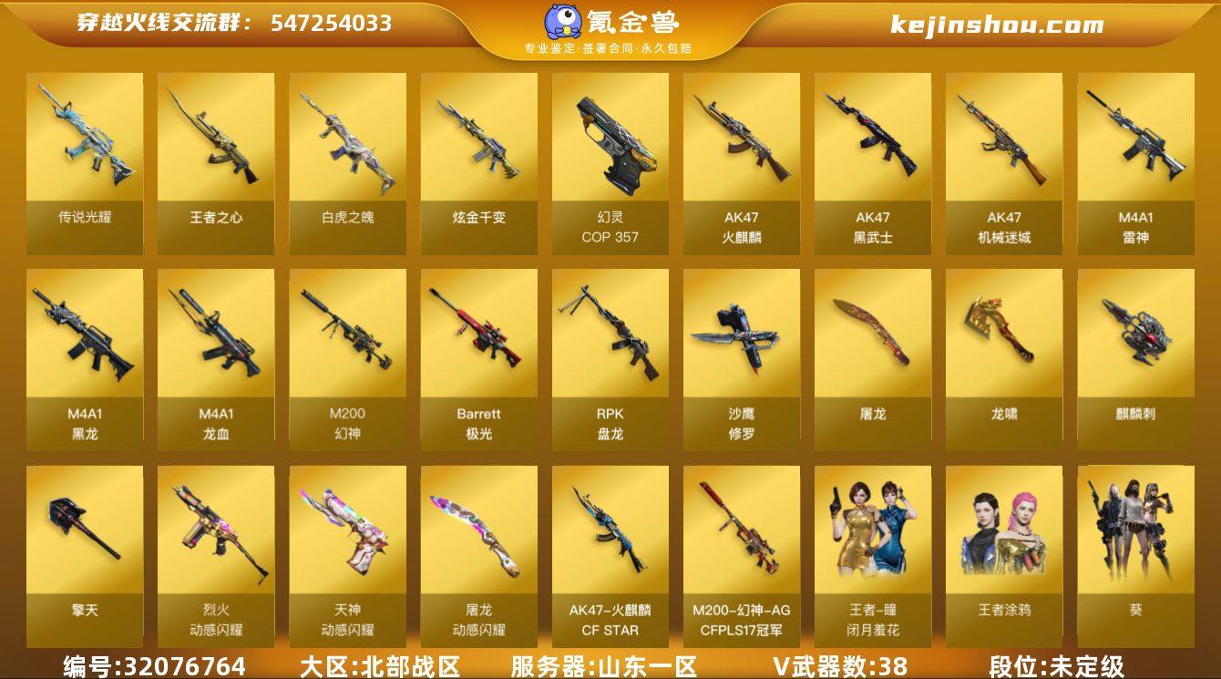 【商品标题】:山东一区-39V-9王者-1炫金 【角色】:王者-瞳-闭月羞花,王者涂鸦,葵 【热门武器】:传说光耀,M200-幻神,白虎之魄,COP 357-幻灵,沙鹰-修罗,RPK-盘龙 【王者炫金武器】:炫金千变,王者之心,白虎之魄 【稀有皮肤】:幻神-AG-CFPLS17冠军,幻神-AG-CFPLS17冠军,火麒麟-CFSTAR,修罗-CFSTAR 【其他皮肤】:QBZ03-麟龙,98K-冰雪霸主,98K-烛龙,修罗-年鹏 【人偶武器】:AWM-灵狐-15周年嘉年华,M4A1-雷神-精英刀锋,COP-旗袍,COP-旗袍 【音效卡】:幻神音效卡,雷神音效卡 【挑战大师】:冰龙粉碎者-白马银枪 【英雄级武器】:M4A1-雷神,烈火-动感闪耀,天神-动感闪耀,屠龙-动感闪耀,手雷-动感闪耀,M4A1-黑龙,M4A1-黑龙,M4A1-黑龙,RPK-盘龙,AK47-火麒麟,AK47-黑武士,AK47-黑武士,AK47-黑武士,AK47-黑武士,AK47-黑武士,Barrett-极光,沙鹰-修罗,擎天,龙啸,龙啸,屠龙,屠龙,屠龙,屠龙,麒麟刺,M4A1-龙血,AK47-机械迷城,AK47-机械迷城,M200-幻神,COP 357-幻灵 【特殊枪械】:0白虎,0黑骑士,0烈龙,1盘龙,0炼狱,0蝴蝶斯泰尔