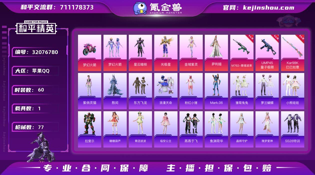 【特价出售/店主推荐】苹果 手Q-5粉装-4特效枪-1载具-1粉色飞行器-26024热力值-3王牌印记-60套装-77枪皮【热门品类】:粉装-梦幻火箭,套装-浪漫天命,套装-粉红小猪,角色-Mark.06【粉色套装】:粉装-梦幻火箭,角色-星云暗核,角色-光极星,角色-金域紫灵,角色-萨利娅【粉色枪皮等级】:M762-青锋波束(五级),UMP45-量子极限(五级),Kar98K-巳巳如意(五级),Mk14-福马献瑞(一级)【粉色载具】:双人摩托-梦幻火箭【粉色枪皮】:M762-青锋波束,UMP45-量子极限,Kar98K-巳巳如意,Mk14-福马献瑞【粉色飞行器】:星夜魔法师飞行翼