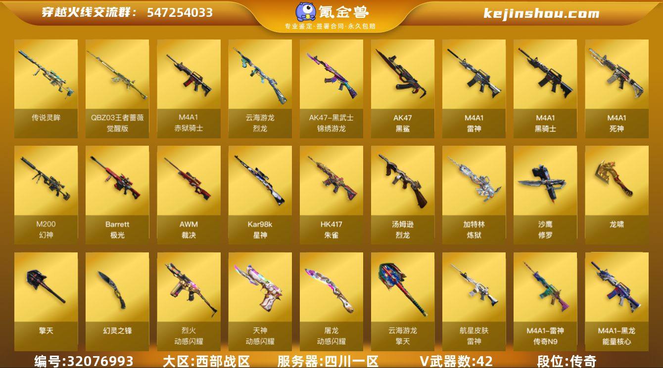 四川一区-47V-2王者武器数-0炫金武器数 【传说武器】:传说灵眸 【热门武器】:传说灵眸,HK417-朱雀,M4A1-青龙,M200-幻神*3,Kar98K-星神,M4A1-黑骑士,汤姆逊-烈龙*5,加特林-炼狱,羊驼玩偶,沙鹰-修罗*4 【音效卡】:擎天-云海游龙音效卡,Barrett-极光音效卡 【皮肤】:幻神-宠儿-2021MVP,AWM-裁决-百城联赛天津皮肤,AWM-裁决-凤灵皮肤,雷神-传奇N9,雷神-航星皮肤,黑龙-能量核心,极光-能量核心,龙啸-纸灯龙皮肤 【角色】:鹰,隼,司雨,王者零-华冠丽服,王者潘多拉,乔伊教练,云海玲珑,暗夜-X,电竞少女,芳心审判者,虎妞,娟娟,灵狐者-七夕宝贝,麻雀,曼陀罗-X,潘多拉-X,青霞仙子,铁骑荣耀,兔囡囡,维纳斯,樱-战斗天使,游珑儿 【人偶武器】:斯泰尔-枪娘暗刃,AWM-灵狐-15周年嘉年华,COP-旗袍,迷你深渊冰龙,迷你裂空之翼,迷你波特博士,迷你曼提柯尔,夺魂,迷你火种,迷你生化手雷*2,生化手雷-机甲核心,深渊终结者手雷,灵狐娃娃手雷 【暴走生化】:异变清道夫,超级对讲机 【挑战大师】:神圣爆裂者III,激光毁灭者III-白马银枪,激光毁灭者III,机甲撕裂者III,试炼破坏者III,KAC-圣炎切割者III 【英雄级武器】:M4A1-雷神*2,M4A1-黑骑士,M4A1-死神,AK47-黑鲨,M4A1-青龙,HK417-朱雀,黑武士-锦绣游龙,烈火-动感闪耀,QBZ-03-王者蔷薇-觉醒版,Barrett-极光,AWM-裁决,M200-幻神*3,Kar98K-星神,加特林-炼狱,炼狱-悦蓝-觉醒版,汤姆逊-烈龙*5,烈龙-云海游龙,沙鹰-修罗*4,天神-动感闪耀,龙啸,擎天,幻灵之锋,屠龙-动感闪耀,擎天-云海游龙,高爆手雷-幻灵*3,手雷-动感闪耀,手雷-云海游龙,闪光弹-幻灵,烟雾弹-幻灵,M4A1-赤狱骑士 【道具】:CFS限定背包,云海游龙炫彩背包,背包-洛丽塔,救世主-黑桃战神,绿色巨人,变异宝贝,生化弹匣,夺命之镰,防化...