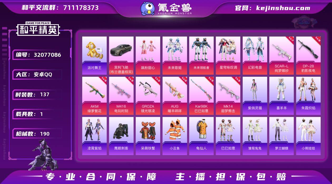 可二次【特价出售/店主推荐】 手Q-5粉装-8特效枪-1载具-3粉色飞行器-62503热力值-6王牌印记-137套装-190枪皮 【热门品类】:套装-派对舞王,套装-小丑鱼,套装-龟仙人 【粉色套装】:粉装-飒粉甜心,粉装-未来歌姬,粉装-未来领航者,粉装-星穹咏叹调,粉装-幻彩电音 【粉色枪皮等级】:AKM-绿萝繁花(五级),SCAR-L-纯梦嫁纱(七级),M416-电玩时刻(五级),GROZA-镜光银凌(五级),AUG-暖羊咩咩(五级),Kar98K-巳巳如意(五级),Mk14-甜梦熊击(五级),DP-28-豹影疾电(五级) 【粉色载具】:宾利飞驰(布罗德盖棕双色) 【粉色枪皮】:AKM-绿萝繁花,SCAR-L-纯梦嫁纱,M416-电玩时刻,GROZA-镜光银凌,AUG-暖羊咩咩,Kar98K-巳巳如意,Mk14-甜梦熊击,DP-28-豹影疾电 【粉色飞行器】:绝色倾城飞行器,圣域金龙飞行器,幻星舰长飞行器 【粉色降落伞】:洛神天依降落伞,第五大道降落伞,仲夏莫吉托降落伞,未来歌姬降落伞,精灵梦叶罗丽降落伞,千金淑猫降落伞,雪月幻音降落伞,星穹咏叹调降落伞,冷漠罗丽降落伞,异瞳寒姬降落伞,炫彩糖果降落伞,霁蓝缠春降落伞 【稀有套装】:套装-龟仙人,套装-巳巳如意,套装-雏菊兔兔,套装-萝兰蝴蝶,套装-小熊娃娃,套装-糖糖葫芦,套装-青团波波,套装-棉花软糖,角色-摩登魅猫,角色-许七安,套装-燕燕于飞,套装-鱼渊荷华,角色-蜜桃派对,套装-粉恋花,套装-紫幽梦,套装-蓝冰羽,套装-星影赞美诗,套装-彩虹兔,套装-云朵鹅,套装-雪绒豹,角色-时希公主,角色-乐音,套装-朱霞炽焰,套装-凌霄紫焰,玩偶服-喜羊羊,角色-紫俏灵猫 【稀有枪皮】:AKM-冰凉西瓜,AKM-彩虹符号,AKM-破晓战魂,AKM-虎虎生威,AKM-龙的传人,M16A4-幻世战舞者,SCAR-L-玉兔迎春,SCAR-L-碧影闪光,SCAR-L-红色方程式,SCAR-L-冷漠罗丽,M416-糯团青竹,M416-绿野极光,M416-葫芦兄弟,GROZA...