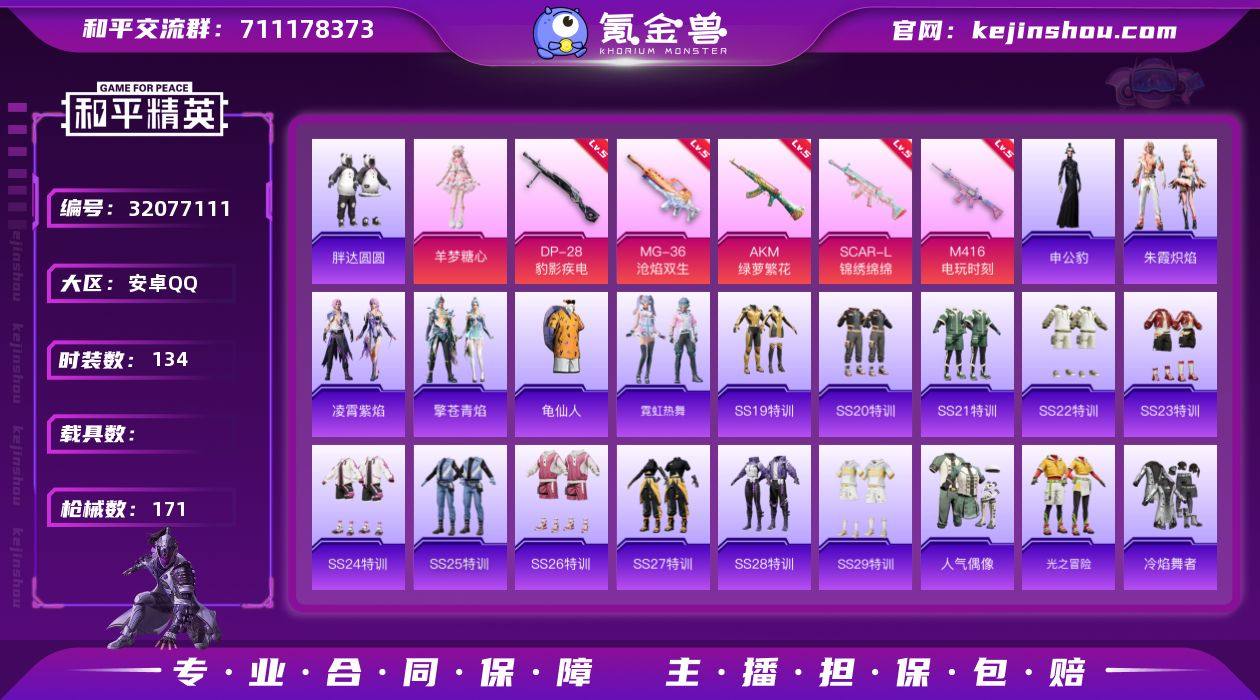 安卓 手Q-1粉装-7特效枪-0载具-2粉色飞行器-46480热力值-12王牌印记-134套装-171枪皮 【热门品类】:套装-胖达圆圆,套装-AG战队服,套装-龟仙人 【粉色套装】:角色-羊梦糖心 【粉色枪皮等级】:AKM-绿萝繁花(五级),SCAR-L-锦绣绵绵(五级),M416-电玩时刻(五级),Mk14-福马献瑞(五级),AA12-G-萌骑幻想(五级),DP-28-豹影疾电(五级),MG-36-沧焰双生(五级) 【粉色枪皮】:AKM-绿萝繁花,SCAR-L-锦绣绵绵,M416-电玩时刻,Mk14-福马献瑞,AA12-G-萌骑幻想,DP-28-豹影疾电,MG-36-沧焰双生 【粉色飞行器】:炫彩糖果飞行器 【粉色降落伞】:绝对恒星降落伞,洛神天依降落伞,垂柳戏鸭降落伞,彩虹甜喵降落伞,炫光之旅降落伞,江南烟雨降落伞,精灵梦叶罗丽降落伞,忍者神龟降落伞,喜羊羊与灰太狼降落伞,炫彩糖果降落伞 【稀有套装】:套装-龟仙人,套装-雪国风尚,套装-炫彩糖果,套装-马上有钱,套装-霓虹热舞,套装-朱霞炽焰,套装-凌霄紫焰,套装-擎苍青焰,角色-申公豹 【稀有枪皮】:AUG-冰晶雪宝,AKM-彩虹符号,AKM-破晓战魂,AKM-霓虹街区,M16A4-幻世战舞者,M16A4-甜心亚梦,SCAR-L-夜灯,SCAR-L-炫彩节奏,SCAR-L-玉兔迎春,M416-糯团青竹,M416-红色方程式,M416-蓝色火焰,GROZA-彩虹符号,GROZA-影袭,AUG-天降萌叽,AUG-耀粉歌者,QBZ-彩虹符号,QBZ-洛神天依,M762-天降萌叽,Mk47-洛神天依,AC-VAL-快闪甜心,AC-VAL-甜心亚梦,蜜獾-天降萌叽,蜜獾-娇憨猪猪,ARX-凌霄紫焰,UZI-啾咪啾咪,UZI-天降萌叽,UZI-娇憨猪猪,UZI-影袭,UZI-红色方程式,UMP45-夜灯,UMP45-涂山之恋,UMP45-蓝色火焰,UMP45-极意拳锋,Vector-彩虹符号,Vector-生命誓言,汤姆逊-天降萌叽,汤姆逊-奇异狩猎者,JS9-凌霄紫焰,P90-快闪甜心,Kar98K-影袭,Kar98K-洛神天依,Kar98K-红色方程式,M24-影袭,AWM-垂柳...