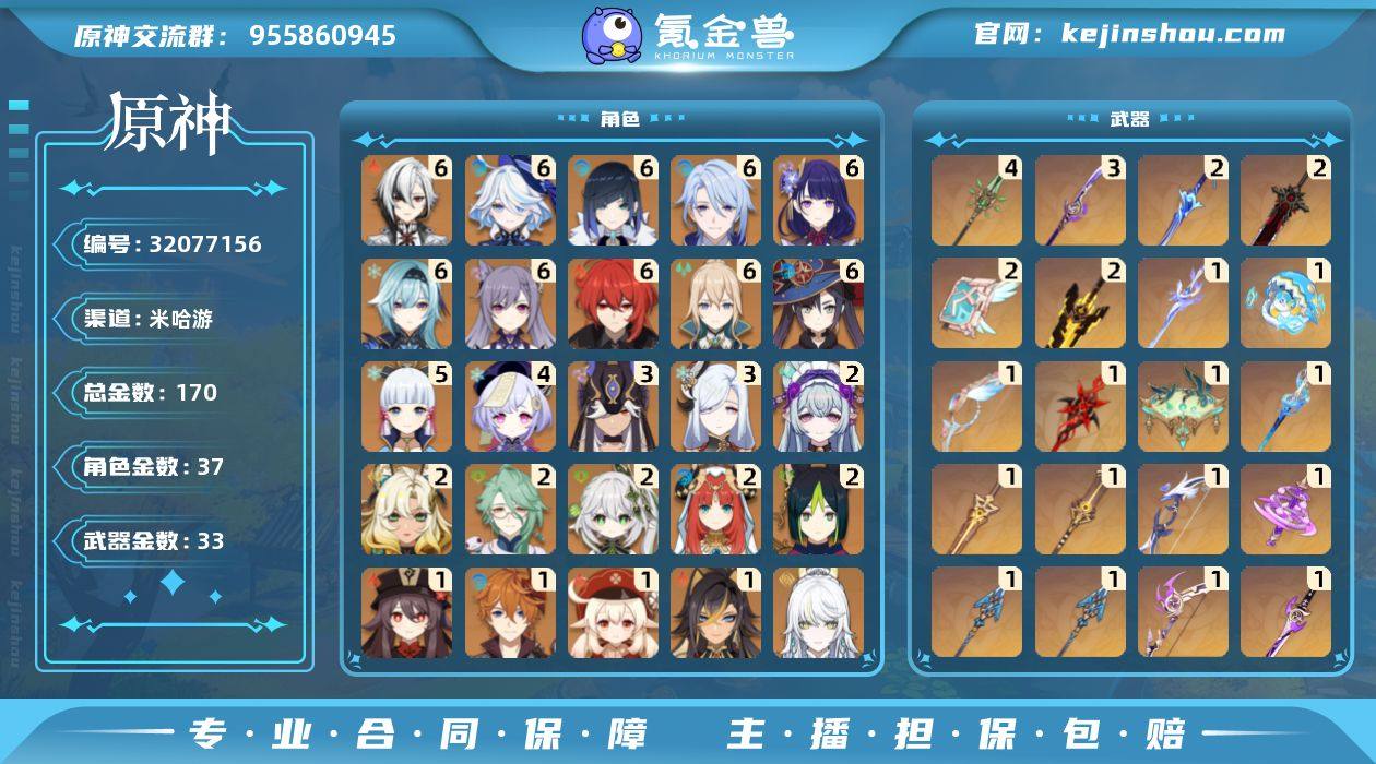 冒险等级:60 总黄数:170 5星角色数:37 5星武器数:33 原石数量:1970 相遇之缘数量:0 纠缠之源数量:0 6命阿蕾奇诺,6命芙宁娜,6命夜兰,6命神里绫人,6命雷电将军,6命优菈,6命刻晴,6命迪卢克,6命琴,6命莫娜,5命神里绫华,4命七七,3命赛诺,3命申鹤,2命梦见月瑞希,2命希诺宁,2命白术,2命纳西妲,2命妮露,2命提纳里,1命胡桃,1命达达利亚,1命可莉,1命迪希雅,0命兹白,0命哥伦比娅,0命玛薇卡,0命茜特菈莉,0命玛拉妮,0命闲云,0命八重神子,0命珊瑚宫心海,0命宵宫,0命枫原万叶,0命阿贝多,0命钟离,0命温迪 6命班尼特,6命菲米尼,6命久岐忍,6命蓝砚,6命赛索斯,6命香菱,6命行秋,6命夏洛蒂,6命夏沃蕾,6命伊安珊,6命芭芭拉,6命北斗,6命重云,6命迪奥娜,6命多莉,6命菲谢尔,6命九条裟罗,6命凯亚,6命卡维,6命坎蒂丝,6命柯莱,6命雷泽,6命罗莎莉亚,6命莱依拉,6命米卡,6命诺艾尔,6命凝光,6命砂糖,6命托马,6命五郎,6命辛焱,6命烟绯,6命瑶瑶,6命云堇,6命早柚,4命嘉明,4命珐露珊,3命叶洛亚,3命卡齐娜,3命琳妮特,3命欧洛伦,3命绮良良,3命伊法,2命安柏,1命塔利雅,1命丽莎,1命鹿野院平藏,0命爱诺,0命埃洛伊 精4和璞鸢,精3薙草之稻光,精2波乱月白经津,精2狼的末路,精2天空之卷,精2无工之剑,精1苍耀,精1冲浪时光,精1白雨心弦,精1赤月之形,精1鹤鸣余音,精1静水流涌之辉,精1圣显之钥,精1赤沙之杖,精1若水,精1神乐之真意,精1息灾,精1飞雷之弦振,精1雾切之回光,精1苍古自由之誓,精1松籁响起之时,精1护摩之杖,精1阿莫斯之弓,精1猎人之径,精1天空之脊,精1天空之翼,精1天空之刃,精1四风原典 100%侦察骑士,古恩希尔德的传承,海风之梦,花时来信,极夜真梦,冷花幽露,闪耀协奏,纱中幽兰,星与月之约,雨化竹身,叶隐芳名,致教会自由人