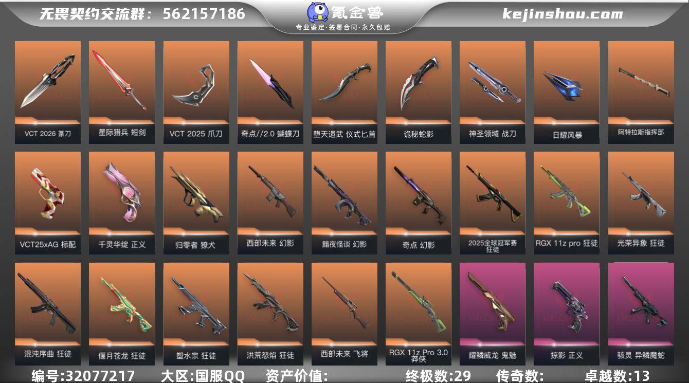 【套装】:VCT 2026 赛季套装,VCT 2025 赛季套装,异鳞魔蛇套装 【英雄】:幻棱,炼狱,维斯,暮蝶,钛狐,壹决,铁臂,捷风,雷兹,幽影,不死鸟,贤者,猎枭,蝰蛇,零,芮娜,奇乐,尚勃勒,霓虹,斯凯,夜露,星礈,K/O,海神,盖可,黑梦,钢锁 【近战武器】:近战武器-VCT 2026 篆刀,近战武器-奇点//2.0 蝴蝶刀,近战武器-VCT 2025 爪刀,近战武器-镭切,近战武器-威龙之刃,近战武器-双生獠牙,近战武器-堕天遗武 仪式匕首,近战武器-诡秘蛇影 军刀,近战武器-神圣领域 战刀,近战武器-日耀风暴 遗器,近战武器-阿特拉斯指挥部 甩棍,近战武器-星际猎兵 短剑 【狂徒】:狂徒-2025全球冠军赛,狂徒-洪荒怒焰,狂徒-混沌序曲,狂徒-塑水宗,狂徒-偃月苍龙,狂徒-RGX 11z Pro,狂徒-光荣异象,狂徒-盖亚的复仇,狂徒-超能偶像,狂徒-诡秘蛇影 【幻影】:幻影-黯夜怪谈,幻影-奇点,幻影-西部未来,幻影-天界神兵//2.0,幻影-异鳞魔蛇,幻影-神圣领域,幻影-末日之翼,幻影-西部未来 【戍卫】:戍卫-般若假面,戍卫-掠影,戍卫-天界神兵,戍卫-超能偶像,戍卫-月球哨兵,戍卫-折光棱晶 【獠犬】:獠犬-归零者,獠犬-神圣领域 【冥驹】:冥驹-堕天遗武,冥驹-离子武器,冥驹-起源,冥驹-星云暗涌 【飞将】:飞将-西部未来,飞将-聚合之力,飞将-末日之翼 【莽侠】:莽侠-RGX 11z Pro//3.0,莽侠-诡秘蛇影,莽侠-月球哨兵 【战神】:战神-神圣领域,战神-采蜜小蜂队 【奥丁】:奥丁-掠影//2.0,奥丁-末日之翼 【判官】:判官-超能偶像,判官-诡秘蛇影,判官-采蜜小蜂队 【雄鹿】:雄鹿-月球哨兵 【骇灵】:骇灵-异鳞魔蛇,骇灵-无限竞技,骇灵-星云暗涌 【蜂刺】:蜂刺-聚合之力,蜂刺-星云暗涌,蜂刺-折光棱晶 【标配】:标配-折光棱晶 【VCT手枪】:标配-VCT25 x AG 【正义】:正义-千灵华绽,正义-掠影,正...