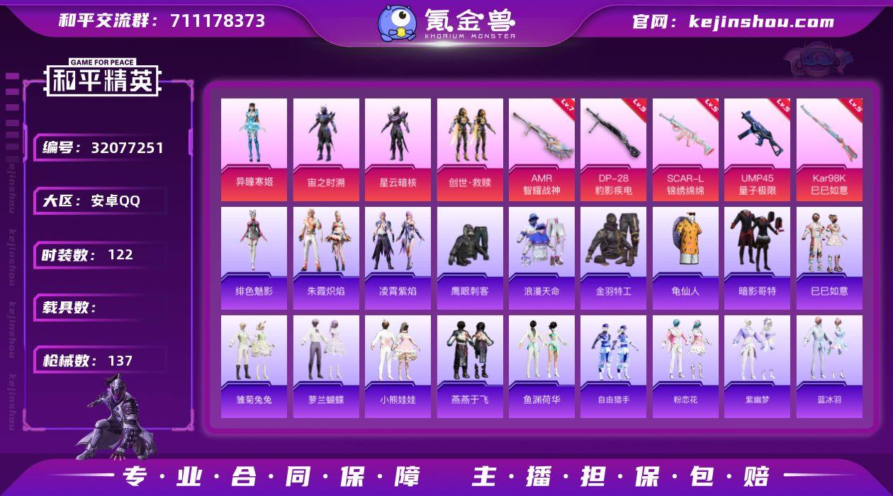 【特价出售/店主推荐】安卓 手Q-4粉装-6特效枪-0载具-1粉色飞行器-41001热力值-6王牌印记-122套装-137枪皮【热门品类】:套装-浪漫天命,套装-金羽特工,套装-龟仙人,套装-暗影哥特【粉色套装】:角色-宙之时溯,角色-星云暗核,套装-创世·救赎,角色-异瞳寒姬【粉色枪皮等级】:SCAR-L-锦绣绵绵(五级),UMP45-量子极限(五级),Kar98K-巳巳如意(五级),Mk14-福马献瑞(四级),AMR-智耀战神(七级),DP-28-豹影疾电(五级)【粉色枪皮】:SCAR-L-锦绣绵绵,UMP45-量子极限,Kar98K-巳巳如意,Mk14-福马献瑞,AMR-智耀战神,DP-28-豹影疾电【粉色飞行器】:拂晓神骑飞行器