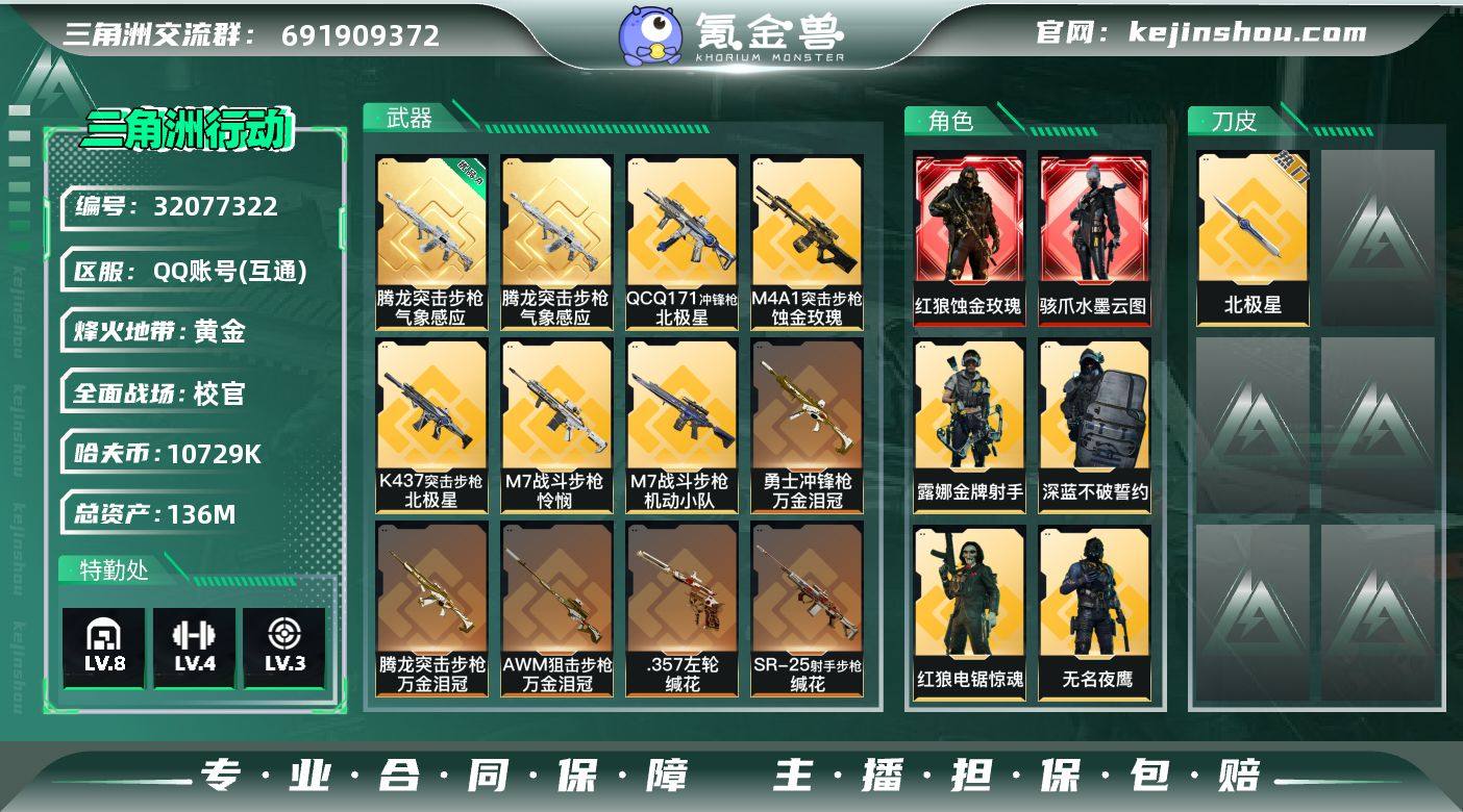 总资产136M/哈夫币1072万/传说近战数1/传说枪皮数34/战场等级50/行动等级60/安全箱等时效性道具以游戏内数据为准,详情请看图/红狼-蚀金玫瑰/骇爪-水墨云图/蜂医-送葬人·无题密令(S5)/无名-夜鹰(S4)/深蓝-不破誓约(S6)/红狼-电锯惊魂/露娜-金牌射手(S7)/近战-北极星/近战-黑鹰/腾龙突击步枪-气象感应/优品A典藏武器外观-腾龙突击步枪-气象感应/M4A1突击步枪-蚀金玫瑰/M4A1突击步枪-阿米娅/AKM突击步枪-锦绣/M16A4突击步枪-狩猎时刻/M7战斗步枪-怜悯/M7战斗步枪-机动小队/SG552突击步枪-运动员/AK-12突击步枪-夜鹰/SCAR-H战斗步枪-水墨云图/SCAR-H战斗步枪-启航/G3战斗步枪-狩猎时刻/G3战斗步枪-骑士/CAR-15突击步枪-阿米娅/腾龙突击步枪-捞点薯条/腾龙突击步枪-万金泪冠/K437突击步枪-北极星/K437突击步枪-锦绣/KC17突击步枪-电锯惊魂/Vector冲锋枪-狩猎时刻/SMG-45冲锋枪-锦绣/勇士冲锋枪-能天使-午夜邮差/勇士冲锋枪-万金泪冠/QCQ171冲锋枪-北极星/725双管霰弹枪-送葬人-无题密令/M250通用机枪-骑士之心/M14射手步枪-蛮荒/M14射手步枪-缄花/SR-25射手步枪-缄花/AWM狙击步枪-捞点薯条/AWM狙击步枪-万金泪冠/.357左轮-缄花/93R-捞点薯条/复合弓-黑-天际线/AKM突击步枪-林中猎...