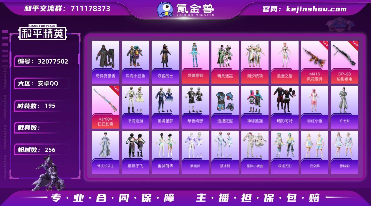 安卓 手Q-4粉装-6特效枪-0载具-1粉色飞行器-77590热力值-5王牌印记-195套装-256枪皮 【热门品类】:套装-深海小丑鱼,套装-奇异狩猎者,套装-浪客战士,旭日初心兜帽大衣,套装-暗影哥特,套装-粉红小猪 【粉色套装】:粉装-精灵迷巫,粉装-潮汐统领,角色-圣堂之誓,角色-异瞳寒姬 【粉色枪皮等级】:M416-风花雪月(七级),AKS-74U-森灵之息(五级),Kar98K-巳巳如意(五级),Mk14-福马献瑞(五级),AA12-G-萌骑幻想(二级),DP-28-豹影疾电(五级) 【粉色枪皮】:M416-风花雪月,AKS-74U-森灵之息,Kar98K-巳巳如意,Mk14-福马献瑞,AA12-G-萌骑幻想,DP-28-豹影疾电 【粉色飞行器】:星之彼岸飞行器 【粉色降落伞】:绝对恒星降落伞,金风玉露降落伞,炫紫旋律降落伞,神秘黑猫降落伞,四圣焕新降落伞,星之彼岸降落伞,百合蜜语降落伞,垂柳戏鸭降落伞,第五大道降落伞,镜域双华降落伞,幽焰骑士降落伞,千金淑猫降落伞,月影灵韵降落伞,星穹咏叹调降落伞,时光之吻降落伞,炫彩糖果降落伞 【稀有套装】:套装-雪国风尚,角色-魂电,角色-罗莉,角色-幸运青,角色-X,角色-阿虎,套装-马上有钱,角色-许七安,角色-怀庆长公主,套装-燕燕于飞,套装-鱼渊荷华,套装-紫幽梦,套装-蓝冰羽,套装-星渊小夜曲,套装-极速光影,套装-云朵鹅,套装-雪绒豹,套装-书海巡游,套装-画境星梦,套装-琴音绮想,套装-雨过天青,套装-红釉青花 【稀有枪皮】:AKM-夜灯,AKM-奇异狩猎者,AKM-星之彼岸,AKM-灼热熔岩,AKM-环太平洋,AKM-破晓战魂,AKM-缤纷海域,AKM-霓虹街区,M16A4-夜灯,M16A4-幻世战舞者,M16A4-机械英豪,M16A4-甜心亚梦,M16A4-蓝色火焰,SCAR-L-炫彩节奏,SCAR-L-玉兔迎春,SCAR-L-红色方程式,SCAR-L-金风玉露,M416-夜灯,M416-滑板小狐,M416-糯团青竹,M416-红色方程式,M416-罗小黑,M416-蓝色火焰...