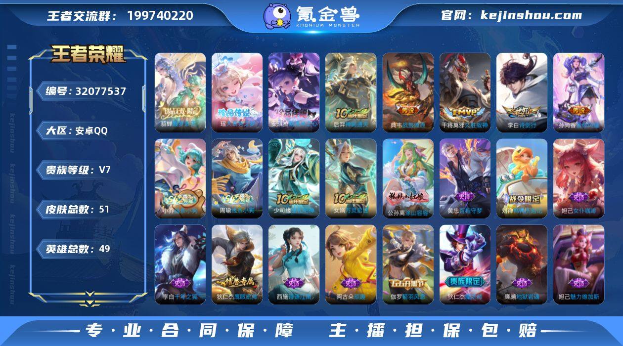 【精品全套慕夏小号·美神临世·大耳狗之梦·酷洛米之心·诗剑行·音你闪耀·战鼓燎原·可二次】YXw13026-安卓Q-49英雄-51皮肤-1王者印记-40铭文-贵族积分3w【贵族7】【1珍品无双·2珍品·5传说·2天幕·9按键】【因赛季更新游戏段付以上号为准!】 【珍品无双】:貂蝉馥梦繁花 【珍品传说】:瑶大耳狗之梦,安琪拉酷洛米之心 【天幕】:繁花交响诗天幕,棉花糖聚会天幕 【传说皮肤】:后羿神树通天,典韦战鼓燎原,李白诗剑行,孙尚香音你闪耀,干将莫邪久胜战神 【限定皮肤】:狄仁杰阴阳师,赵云皇家上将,狄仁杰魔术师,项羽海滩派对 【赛季限定】:钟馗虚灵犬护 【战令限定】:刘禅鸭鸭历险记,沈梦溪鸭鸭历险记,周瑜线条小狗,小乔线条小狗 【史诗皮肤】:赵云皇家上将,狄仁杰魔术师,廉颇地狱岩魂,妲己魅力维加斯,妲己女仆咖啡,李白千年之狐,刘禅天才门将,伽罗箭羽风息,狄仁杰鹰眼统帅,西施诗语江南,艾琳奇遇舞章,阿古朵顽趣,刘禅鸭鸭历险记,黄忠百相守梦,公孙离涂山容容,女娲万灵启世,少司缘巫礼祀神,小乔线条小狗,周瑜线条小狗 【其他皮肤】:项羽海滩派对,达摩大发明家,赵云忍炎影,亚瑟死亡骑士,达摩拳王,张飞五福同心,后羿阿尔法小队,狄仁杰阴阳师,刘备汉昭烈帝,关羽龙腾万里,王昭君幻想奇妙夜,钟馗虚灵犬护,沈梦溪鸭鸭历险记,阿古朵布丁狗之约,鬼谷子克喵,艾琳鹤鸣心笺,蚩奼极光幻客,虞姬溯影追猎,鲁班七号福禄兄弟,后羿精灵王,兰陵王隐刃,夏侯惇战争骑士,黄忠芝加哥教父,上官婉儿修竹墨客