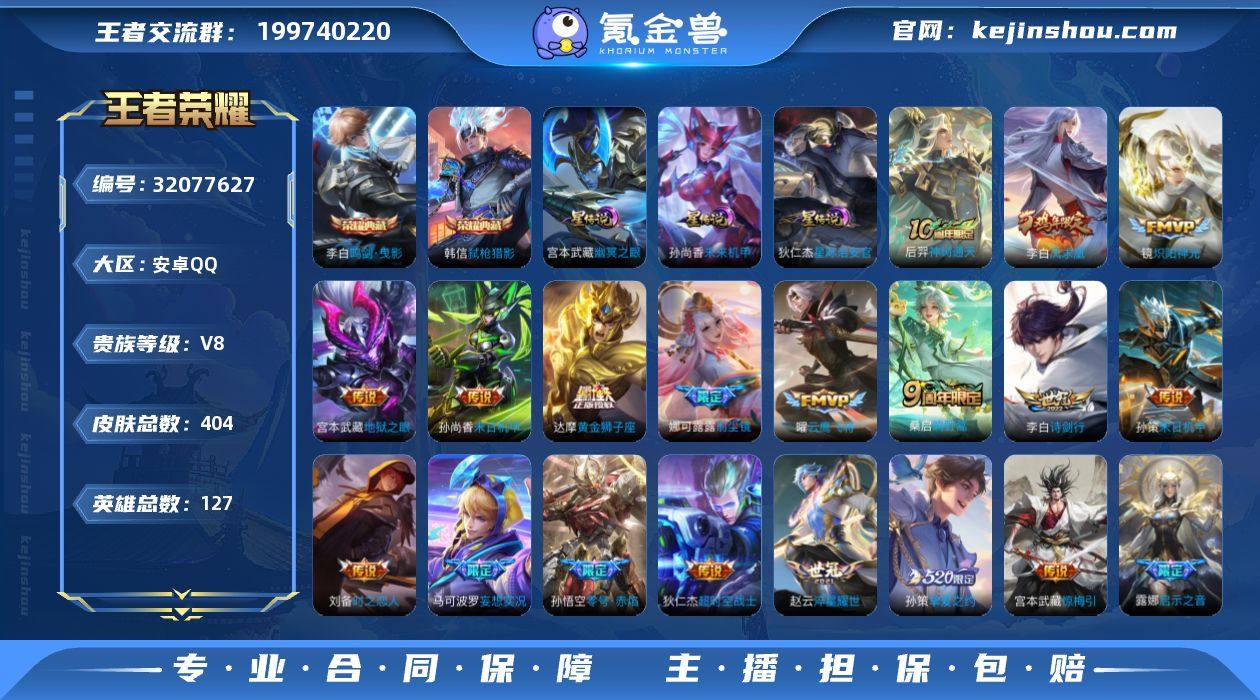 【极品404皮·鸣剑曳影·弑枪猎影·4星传说·惊梅引·妄想实况·电玩雷克斯·诗剑行·前尘镜·挚爱之约·启示之音·淬星耀世·炽阳神光·零号赤焰·云鹰飞将·凤求凰·至尊宝·朱雀志·飞衡·御风骁将·山海玄木吟·可二次】YXw17245-安卓Q-127英雄-404皮肤-25王者印记-300铭文-贵族积分8w【贵族8】【2典藏·4星传说·24传说·1天幕·8按键】【因赛季更新游戏段付以上号为准!】 【英雄全皮】:娜可露露全皮,狂铁全皮,空空儿全皮,影全皮 【荣耀典藏】:李白鸣剑曳影,韩信弑枪猎影 【星元皮肤】:孙尚香未来机甲,狄仁杰星际治安官,刘备时之思念,宫本武藏幽冥之眼 【天幕】:共赏芳华天幕 【传说皮肤】:后羿神树通天,桑启鸣野蒿,宫本武藏惊梅引,马可波罗妄想实况,澜电玩雷克斯,李白诗剑行,娜可露露前尘镜,孙策挚爱之约,露娜启示之音,孙策末日机甲,赵云淬星耀世,铠绛天战甲,镜炽阳神光,虞姬启明星使,孙悟空零号赤焰,曜云鹰飞将,刘备时之恋人,达摩黄金狮子座,梦奇胖达荣荣,李白凤求凰,孙尚香末日机甲,宫本武藏地狱之眼,孙悟空地狱火,狄仁杰超时空战士 【限定皮肤】:白起狰,李白谪仙醉月,狄仁杰阴阳师,虞姬凯尔特女王,赵云皇家上将,赵云引擎之心,墨子神迹守卫,嬴政优雅恋人,嬴政白昼王子,孙尚香蔷薇恋人,鲁班七号狮舞东方,庄周高山流水,高渐离死亡摇滚,高渐离玩趣恶龙,钟无艳超时空战士,孙膑天狼运算者,扁鹊炼金王,扁鹊奇幻香踪,白起夜都怪侠,芈月重明,芈月幻夜卜梦,吕布猎兽之王,吕布御风骁将,周瑜赤莲之焰,元歌云间偶戏,元歌无心,夏侯惇朔风刀,甄姬游园惊梦,甄姬落雪兰心,曹操烛龙,典韦穷奇,典韦蓝屏警告,马可波罗逐梦之星,马可波罗暗影游猎,马可波罗山海玄木吟,马可波罗妄想实况,狄仁杰魔术师,狄仁杰万华元夜,达摩星际陆战队,达摩沙漠行僧,项羽海滩派对,老夫子圣诞...