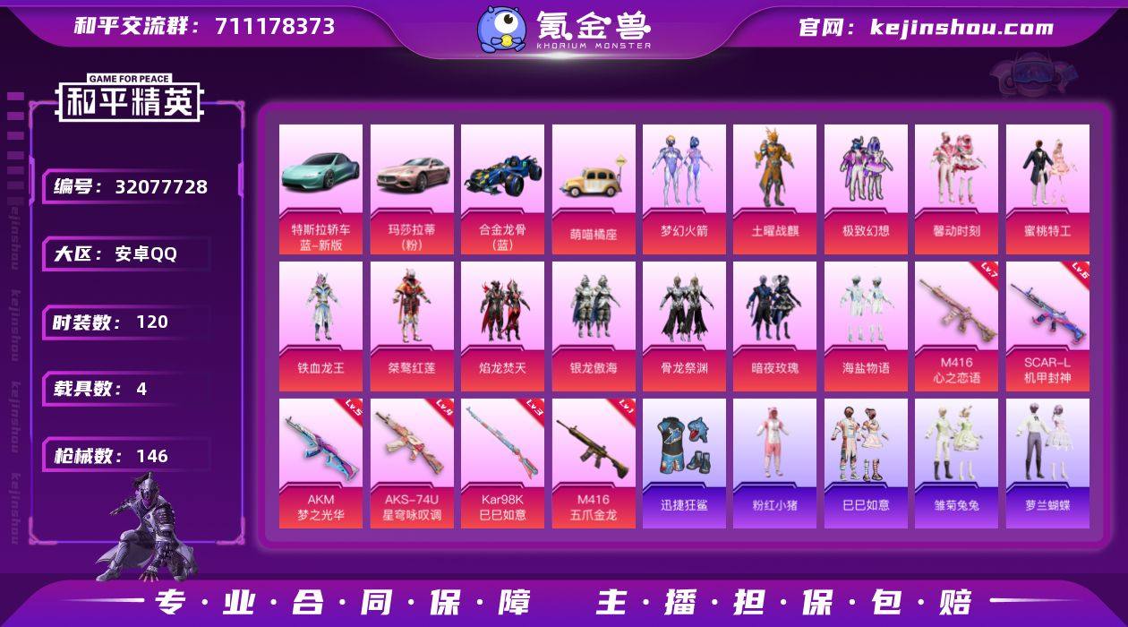可二次【特价出售/店主推荐】安卓 手Q-12粉装-6特效枪-4载具-2粉色飞行器-52662热力值-9王牌印记-120套装-146枪皮 【热门品类】:粉装-梦幻火箭,套装-粉红小猪 【粉色套装】:粉装-土曜战麒,粉装-梦幻火箭,粉装-极致幻想,粉装-馨动时刻,粉装-蜜桃特工,粉装-铁血龙王,粉装-桀骜红莲,粉装-焰龙焚天,粉装-银龙傲海,粉装-骨龙祭渊,粉装-暗夜玫瑰,粉装-海盐物语 【粉色枪皮等级】:AKM-梦之光华(五级),SCAR-L-机甲封神(六级),M416-五爪金龙(一级),M416-心之恋语(七级),AKS-74U-星穹咏叹调(四级),Kar98K-巳巳如意(三级) 【粉色载具】:特斯拉Roadster(水滴蓝),玛莎拉蒂Ghibli(粉),合金龙骨(蓝),萌喵橘座 【粉色枪皮】:AKM-梦之光华,SCAR-L-机甲封神,M416-五爪金龙,M416-心之恋语,AKS-74U-星穹咏叹调,Kar98K-巳巳如意 【粉色飞行器】:梦之光华飞行器,机甲封神飞行器 【粉色降落伞】:甜心宝贝降落伞,至尊龙雀降落伞,梦幻火箭降落伞,童趣迷兔降落伞,王牌四分卫降落伞,机甲封神降落伞,焰龙焚天降落伞,风花雪月降落伞,环太平洋降落伞,魔法神域降落伞,时空协奏降落伞,月影灵韵降落伞,幻彩电音降落伞 【稀有套装】:套装-巳巳如意,套装-雏菊兔兔,套装-萝兰蝴蝶,角色-多纳泰罗,套装-糖糖葫芦,套装-青团波波,套装-粉恋花,套装-紫幽梦,套装-蓝冰羽 【稀有枪皮】:AKM-彩虹符号,AKM-萌趣颜团子,AKM-虎虎生威,M16A4-幻世战舞者,M16A4-甜心亚梦,SCAR-L-炫彩节奏,SCAR-L-玉兔迎春,SCAR-L-王牌四分卫,M416-糯团青竹,M416-蓝色火焰,GROZA-林间仙鹿,GROZA-治愈之星,AUG-焰龙焚天,AUG-青春冒险家,QBZ-彩虹符号,QBZ-暗翼战神,QBZ-赛罗,QBZ-飞驰魅影,M762-天降萌叽,M762-深海曼妙,M762-瑞龙福将,Mk47-青春冒险家,G36C-时空追击者,G36C-暗夜玫瑰,AC-VAL-甜心...