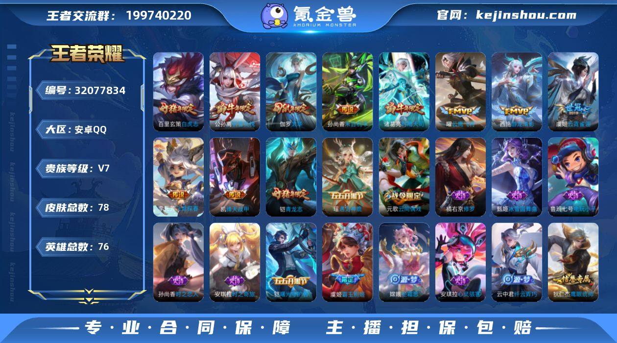 安卓Q-V7-荣耀黄金II段位-76英雄-78皮肤-10传说-25史诗 【传说皮肤】:西施游龙清影,李元芳飞鸢探春,公孙离祈雪灵祝,诸葛亮时雨天司,铠绛天战甲,曜云鹰飞将,伽罗太华,虞姬云霓雀翎,百里玄策白虎志,孙尚香末日机甲 【限定皮肤】:狄仁杰阴阳师,赵云皇家上将,庄周高山流水,元歌云间偶戏,甄姬游园惊梦,曹操烛龙,狄仁杰魔术师,狄仁杰万华元夜,达摩沙漠行僧,项羽海滩派对,亚瑟潮玩骑士王,李元芳银河之约,虞姬霸王别姬,太乙真人饕餮,鬼谷子原初探秘者,诸葛亮时雨天司,铠青龙志,苏烈千军破阵,百里玄策白虎志,弈星混沌棋,公孙离祈雪灵祝,云中君纤云弄巧,伽罗太华,嫦娥拒霜思,桑启海盐诗旅,张良古海寻踪 【年限皮肤】:百里玄策白虎志,铠青龙志,伽罗太华,公孙离祈雪灵祝,诸葛亮时雨天司 【赛季限定】:太乙真人饕餮,曹操烛龙,弈星混沌棋,鬼谷子原初探秘者,狄仁杰万华元夜,苏烈千军破阵,达摩沙漠行僧,桑启海盐诗旅,张良古海寻踪 【战令限定】:李元芳银河之约,元歌云间偶戏,亚瑟潮玩骑士王 【史诗皮肤】:嫦娥拒霜思,庄周高山流水,安琪拉时之奇旅,百里玄策热力回旋,西施诗语江南,元歌云间偶戏,云中君纤云弄巧,孙尚香时之恋人,瑶遇见神鹿,橘右京修罗,李元芳银河之约,狄仁杰鹰眼统帅,铠青龙志,李元芳逐浪之夏,铠曙光守护者,安琪拉心灵骇客,甄姬游园惊梦,小乔缤纷独角兽,虞姬霸王别姬,妲己魅力维加斯,孙尚香水果甜心,狄仁杰魔术师,甄姬冰雪圆舞曲,赵云皇家上将,鲁班七号电玩小子 【其他皮肤】:张良古海寻踪,桑启海盐诗旅,达摩沙漠行僧,苏烈千军破阵,露娜瓷语鉴心,亚瑟潮玩骑士王,狄仁杰万华元夜,鬼谷子原初探秘者,弈星混沌棋,庄周奇妙博物学,孙尚香沉稳之力,曹操烛龙,宫本武藏霸王丸,太乙真人饕餮,狄仁杰阴阳师,后羿阿尔法小队,甄姬...