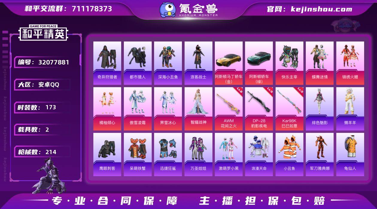 可二次【特价出售/店主推荐】安卓 手Q-7粉装-3特效枪-2载具-3粉色飞行器-74811热力值-15王牌印记-173套装-214枪皮 【热门品类】:套装-浪漫天命,套装-都市猎人,套装-深海小丑鱼,套装-小丑鱼,套装-奇异狩猎者,角色-军刀雅典娜,套装-浪客战士,套装-龟仙人,套装-暗影哥特 【粉色套装】:粉装-快乐主宰,粉装-蝶舞迷情,粉装-锦绣火鲤,粉装-橘柚倾心,粉装-傲雪凌霜,粉装-霁雪冰心,角色-智耀战神 【粉色枪皮等级】:Kar98K-巳巳如意(五级),AWM-花间之火(六级),DP-28-豹影疾电(五级) 【粉色载具】:阿斯顿马丁DBS(绿),阿斯顿马丁DBS(金) 【粉色枪皮】:Kar98K-巳巳如意,AWM-花间之火,DP-28-豹影疾电 【粉色飞行器】:炫彩糖果飞行器,春暖花开飞行器,锦绣火鲤飞行器 【粉色降落伞】:快乐主宰降落伞,春暖花开降落伞,锦绣火鲤降落伞,荧光虫舞降落伞,夏日绵绵冰降落伞,香水柠檬降落伞,暗夜玫瑰降落伞,橘柚倾心降落伞,筑梦精灵降落伞,暖熊萌萌降落伞,绒雪飘舞降落伞,垂柳戏鸭降落伞,仲夏莫吉托降落伞,猪猪侠降落伞,智耀战神降落伞,冷漠罗丽降落伞,炫彩糖果降落伞 【稀有套装】:套装-龟仙人,套装-巳巳如意,套装-雪国风尚,套装-炫彩糖果,套装-马上来财,角色-拉斐尔,角色-光矢逐梦,角色-灵公主,玩偶服-懒羊羊,角色-绯色魅影 【稀有枪皮】:AUG-冰晶雪宝,AKM-夜灯,AKM-奇异狩猎者,AKM-彩虹符号,AKM-影袭,AKM-春暖花开,AKM-生命誓言,AKM-破晓战魂,AKM-缤纷海域,AKM-虎虎生威,AKM-锦绣火鲤,AKM-龙的传人,M16A4-幻世战舞者,M16A4-快乐主宰,M16A4-甜心亚梦,M16A4-千金淑猫,SCAR-L-夜灯,SCAR-L-浪客战士,SCAR-L-炫彩节奏,SCAR-L-玉兔迎春,SCAR-L-红色方程式,M416-糯团青竹,M416-红色方程式,M416-蓝色火焰,M416-萌萌史莱姆,GROZA-彩虹符号,GROZA-影袭,GR...