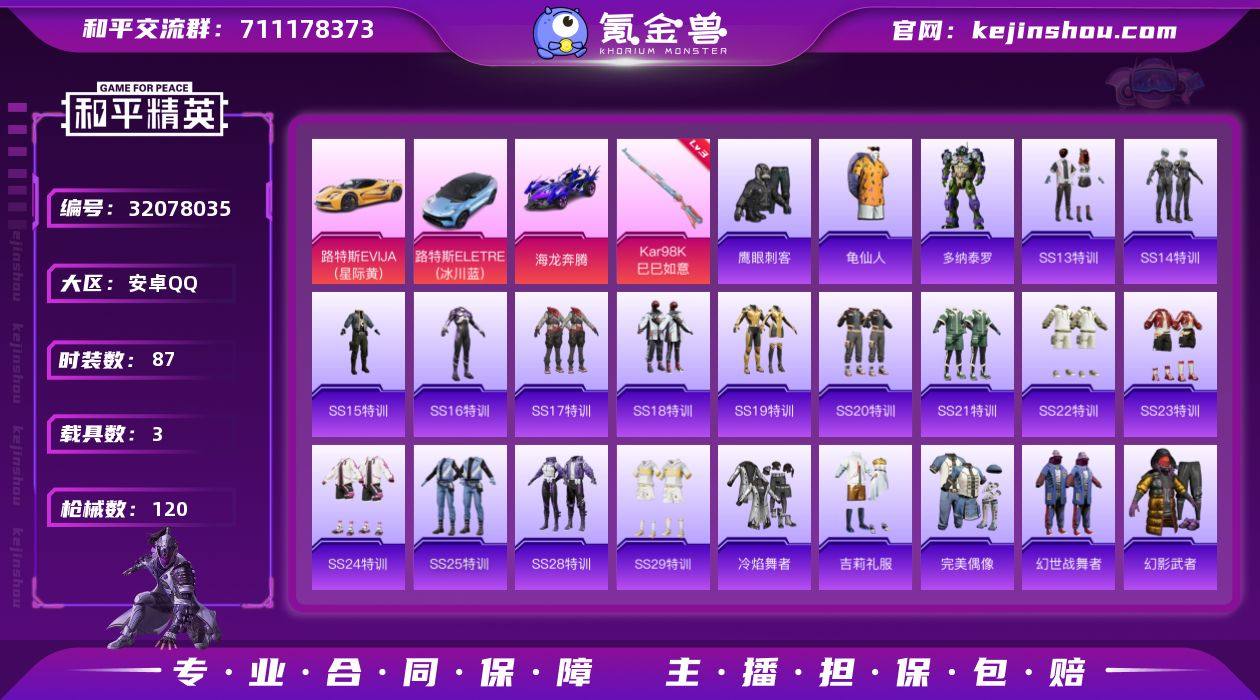 【特价出售/店主推荐】安卓 手Q-1粉装-3特效枪-3载具-0粉色飞行器-38060热力值-4王牌印记-87套装-120枪皮【热门品类】:套装-龟仙人【粉色套装】:角色-辉云木星【粉色枪皮等级】:UMP45-萌骑冒险(三级),Kar98K-巳巳如意(三级),Mk14-福马献瑞(五级)【粉色载具】:路特斯EVIJA(星际黄),路特斯ELETRE(冰川蓝),海龙奔腾【粉色枪皮】:UMP45-萌骑冒险,Kar98K-巳巳如意,Mk14-福马献瑞