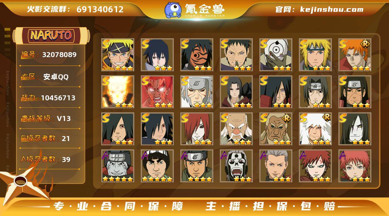 实名:可二次实名 贵族等级:V13 战力值:10456713 S忍数:21 A忍数:39 三星漩涡鸣人·宇智波佐助,三星宇智波佐助「永恒万花筒」,三星神秘面具男「红夜之刃」,三星宇智波带土「忍界大战」,三星宇智波斑「白面具」,三星波风水门,三星佩恩·天道「超」,三星漩涡鸣人「九喇嘛连结」,三星迈特凯「死门」,三星千手扉间「秽土转生」,三星宇智波鼬「秽土转生」,三星宇智波斑「秽土转生」,三星宇智波鼬「须佐能乎」,三星千手柱间「秽土转生」,三星宇智波斑,三星宇智波斑「木叶创立」,三星长门「秽土转生」,三星大野木「忍界大战」,三星艾「三代目雷影」,三星自来也「舞之豪杰」,三星大蛇丸 五星干柿鬼鲛,五星迈特凯,四星猿飞阿斯玛,三星飞段「死司凭血」,三星飞段,三星我爱罗「疾风传」,三星蝎,二星迈特凯「青春爆炸」,二星巳月「仙人模式」,二星宇智波鼬「夏日限定」,二星宇智波止水,二星长门「青年」,二星佩恩·六道「漂泊浪客」,二星艾「青年」,二星达鲁伊「五代目雷影」,二星神秘面具男「忍者之路」,二星波风水门「青年」,二星奇拉比「忍界大战」,二星黑土「博人传」,二星宇智波佐助「须佐能乎」,二星桃地再不斩「漂泊武士」,二星迪达拉「秽土转生」,二星宇智波带土「暴怒」,二星猿飞木叶丸「博人传」,二星漩涡鸣人「九尾查克拉」,二星千代「近松十人卫」,二星宇智波佐助「疾风传咒印」,二星秋道丁次「忍界大战」,二星大蛇丸「晓」,二星猿飞阿斯玛「秽土转生」,二星春野樱「百豪」,二星波风水门「新春限定」,二星照美冥「五代目水影」,二星志村团藏,二星漩涡鸣人「仙人模式」,二星角都,二星小南,二星迪达拉,二星宇智波鼬 卖家说:85片十尾带土,99片罗砂,76片秽土半藏,60片金式。1045W战力,通灵开到梦貘,有熊猫蛞蝓沙之守鹤二尾猫又