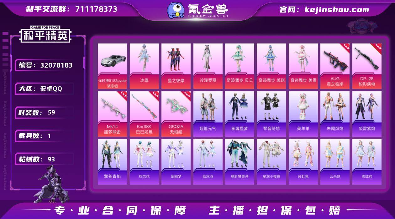 安卓 手Q-6粉装-6特效枪-1载具-1粉色飞行器-29640热力值-2王牌印记-59套装-93枪皮 【粉色套装】:粉装-星之彼岸,角色-冷漠罗丽,角色-奇迹舞步 贝贝,角色-奇迹舞步 美琪,角色-奇迹舞步 美雪,角色-冰魄 【粉色枪皮等级】:GROZA-无垠阁(三级),AUG-星之彼岸(六级),UMP45-萌骑冒险(五级),Kar98K-巳巳如意(四级),Mk14-甜梦熊击(五级),DP-28-豹影疾电(五级) 【粉色载具】:保时捷918 Spyder(液态银) 【粉色枪皮】:GROZA-无垠阁,AUG-星之彼岸,UMP45-萌骑冒险,Kar98K-巳巳如意,Mk14-甜梦熊击,DP-28-豹影疾电 【粉色飞行器】:炫彩糖果飞行器 【粉色降落伞】:星之彼岸降落伞,星穹咏叹调降落伞,幻彩电音降落伞,奇迹舞步降落伞,无垠阁降落伞,炫彩糖果降落伞,辉光之愿降落伞,虹云熊熊降落伞 【稀有套装】:套装-超能元气,套装-雪国风尚,套装-炫彩糖果,套装-马上来财,套装-粉恋花,套装-紫幽梦,套装-蓝冰羽,套装-星影赞美诗,套装-星渊小夜曲,套装-彩虹兔,套装-云朵鹅,套装-雪绒豹,角色-绛羽幽主,角色-夜瞳黯灵,套装-朱霞炽焰,套装-凌霄紫焰,套装-擎苍青焰,玩偶服-美羊羊,套装-画境星梦,套装-琴音绮想,角色-幽雨猫猫 【稀有枪皮】:AKM-星之彼岸,M16A4-幻世战舞者,SCAR-L-夜灯,SCAR-L-炫彩节奏,M416-蓝色火焰,GROZA-恐龙拽拽,M762-彩虹符号,M762-云朵鹅,G36C-星穹咏叹调,AC-VAL-天降萌叽,蜜獾-绯穹魔姬,ACE32-画境星梦,ARX-凌霄紫焰,UZI-天降萌叽,UMP45-极意拳锋,MP5K-画境星梦,AKS-74U-鬼刀,JS9-凌霄紫焰,Kar98K-星穹咏叹调,M24-幻彩电音,AWM-奇迹舞步,VSS-星之彼岸,Mini14-绯穹魔姬,SVD-云朵鹅,M1加兰德-画境星梦,DBS-第五大道,AA12-G-画境星梦,SPAS-12-云朵鹅,M249-星之彼岸,M249-糯团青竹,MG3-幻世战舞者,MG-36-凌霄紫焰,P92-凌霄紫焰,R45-...