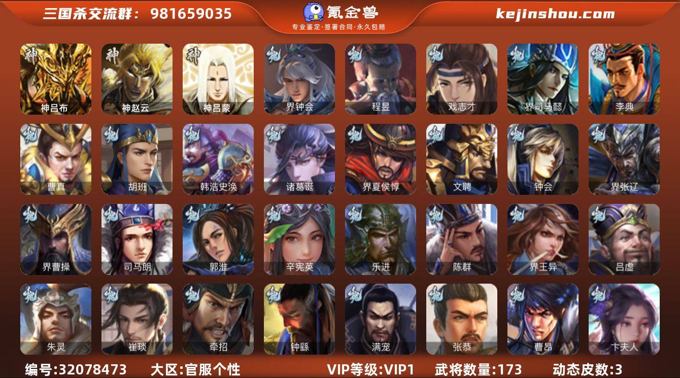 9史诗中军,8.4万羽毛,回廊动白马,神赵云,神吕布,戏志才,界钟会,沙摩柯,谋赵云,动态左慈,程昱9史诗,神吕蒙,动态孙茹,谋韩当,崔琰,胡班,界孙休,势田丰,界曹植,界于吉,张恭,牵招,金皮界王异,彭恙,界马超,谋庞统,张布,界朱治,友庞统,界刘表,王濬173将,国战60将,7.6万豆,满级活树