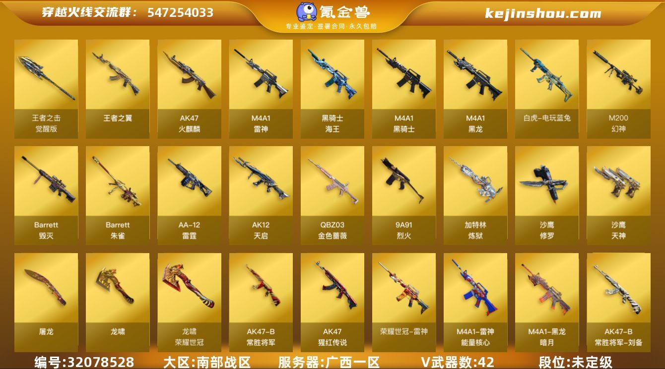 广西一区-53V-7王者武器数-0炫金武器数 【热门武器】:QBZ03-金色蔷薇,M200-幻神,荣耀世冠-火麒麟,荣耀世冠-雷神,白虎-电玩蓝兔,荣耀世冠-柯尔特,M4A1-黑骑士,加特林-炼狱,沙鹰-修罗*4,荣耀世冠-龙啸,金刚伞 【王者炫金武器】:王者之翼 【音效卡】:M4A1-黑骑士音效卡,M4A1-苍鸣雷神音效卡 【皮肤】:幻神-周瑜皮肤,幻神-电竞之星 皮肤,白虎-电玩粉兔皮肤,雷神-能量核心,毁灭-英雄计划 皮肤,黑龙-暗月,战神-紫绶金章皮肤,战神-流金岁月皮肤,AK47-B-常胜将军-刘备*2,屠龙-荣耀世冠AG 【角色】:魅影,乔伊教练,幻面灵狐,暗夜-X,初恋灵狐,风暴女*2,嘉年华灵狐,娟娟,灵狐者-七夕宝贝,龙儿,龙儿-小淘气,麻雀,潘多拉-X,潘多拉-甜心教官,斯沃特-X,雪莉杨-摸金校尉,夜玫瑰-宠粉 【人偶武器】:天龙-曼陀罗,火麒麟-灵狐,AWM-灵狐-15周年嘉年华,迷你深渊冰龙,夺魂,迷你牛牛,迷你生化手雷,生化手雷-机甲核心,闪光弹-貂蝉,高爆手雷-大乔,迷你艾比,迷你超能女侍 【暴走生化】:黑龙吞噬者,超级对讲机 【挑战大师】:冰龙粉碎者-白马银枪 【英雄级武器】:AK47-火麒麟,M4A1-黑龙,M4A1-雷神*2,M4A1-黑骑士,AK12-天启,QBZ03-金色蔷薇,9A91-烈火,AK-47-猩红传说,王者冰魄-觉醒版,黑骑士-海王,AK47-B-常胜将军*2,白虎-电玩蓝兔,荣耀世冠-火麒麟,荣耀世冠-雷神,HK417-朱雀-电竞之星,机械迷城-穹宇,Barrett-毁灭,M200-幻神,Barrett-朱雀,加特林-炼狱,AA-12-雷霆,沙鹰-修罗*4,沙鹰-天神*4,COP 357-雷霆王者-觉醒版,荣耀世冠-柯尔特,屠龙,龙啸,荣耀世冠-龙啸,王者之锋-觉醒版,王者之击-觉醒版,高爆手雷-幻灵,闪光弹-幻灵,闪光弹-雷霆王者-觉醒版 【道具】:BS战队炫彩背包,亚洲杯纪念炫彩背包,炫彩背包-诺拉,超级背包,绿色巨人,灵魂忍者,变异宝...