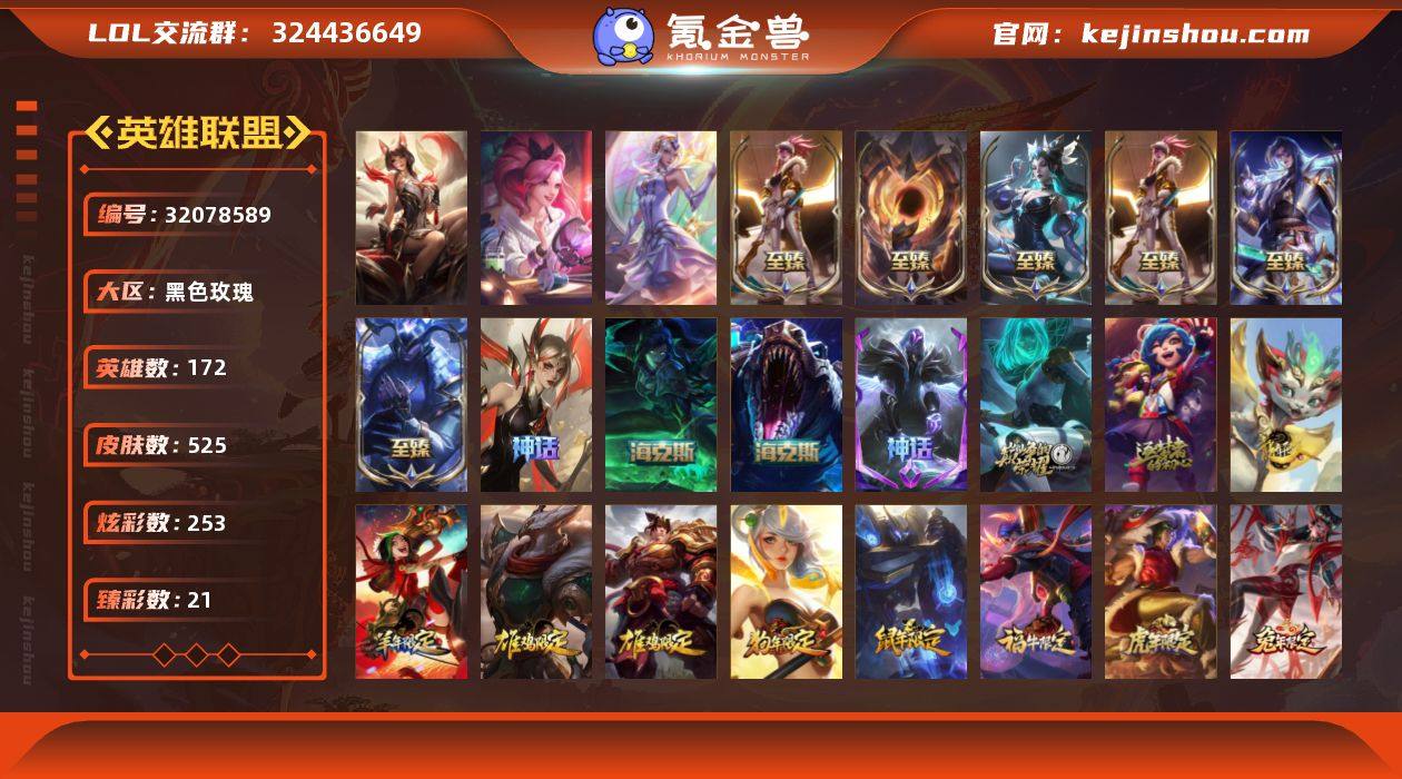 未定级段位-172英雄-525皮肤-253炫彩-4终极-14神话-88限定-57传说-89史诗 【神话皮肤】:十周年纪念安妮,源代码乐芙兰,殿堂传奇乐芙兰,神凰行者瑞羽圣凰艾尼维亚,水晶泰坦诺提勒斯,灰烬骑士派克,海克斯科技雷克顿,摄魂使者薇恩,至臻暗星墨菲特,至臻DRX亚托克斯,至臻KDA阿卡丽,至臻KDA阿卡丽2022,至臻星之守护者辛德拉,至臻心之钢永恩 【热门头像】:觅心之翼奎因头像,玉剑传说舞剑仙头像,KDA阿卡丽头像 【卓越皮肤】:殿堂传奇阿狸 【至臻皮肤】:至臻暗星墨菲特,至臻KDA阿卡丽,至臻KDA阿卡丽(2022),至臻星之守护者辛德拉,至臻DRX亚托克斯,至臻心之钢永恩 【臻彩皮肤】:天龙之子卡莎飞龙乘云,无畏骑士瑟庄妮赤子初心,冠军之箭艾希凯旋圣装,墨之影武者亚索金墨耀影,玉剑传说舞剑仙轩辕,冠军掠夺者卡兹克凯旋圣装,冠军之刃锐雯2016凯旋圣装,冠军之矛卡莉丝塔凯旋圣装,神龙尊者圣龙李青登龙,源计划联合艾希红莲之弓,星之守护者辛德拉未来之光,星之守护者金克丝黑洞,星之守护者卡莎热情之光,灵魂莲华亚索霜见之时,可爱可爱粉红红布里茨,星之守护者阿卡丽未来之光,殿堂传奇乐芙兰登神,星之守护者阿卡丽热情之光,魔女阿卡丽虚荣,净雪之月莫甘娜冬虹 【年限皮肤】:定海神珍孙悟空,神龙烈焰金克丝,张辽文远,司马懿仲达,春晖神女拉克丝,王国机神玄武盖伦,福牛守护者厄斐琉斯,龙腾虎跃瑟提,剪纸仙灵婕拉,天龙之子斯莫德,点心宝贝阿木木 【海克斯皮肤】:海克斯科技雷克顿,摄魂使者薇恩 【情人节限定】:甜心之羽霞,觅心萝莉金克丝,幽梦玫瑰泰隆 【冰雪限定】:冬境仙灵索拉卡,圣诞开心鬼提莫,圣诞糖果棒厄运小姐,圣诞狂欢基兰,阿木木“主人不要我了”,平安夜女神娑娜,雪默丁格,圣诞玩偶波比,冰雪驯鹿波比,魄罗骑士瑟庄妮,寒冬精灵璐璐,圣诞老人德莱文,圣诞...