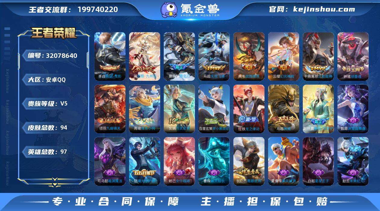 【W5900】安卓QQ-有二次-贵6-97英雄-94皮肤-1典藏-6传说-29限定-6按键-灵宝-4印记-1万贵族积分-营地1714601394-热门皮肤-李白鸣剑·曳影,澜愿照·九州拓,云缨幻光神枪,夏侯惇霜北刀,典韦战鼓燎原,马超无双飞将,马超神威