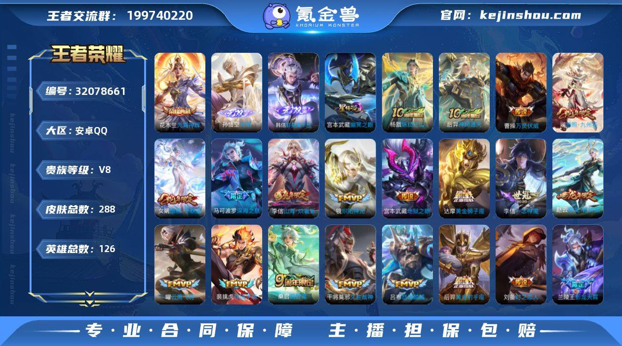 【精品推荐·九霄神辉·无相·群星魔术团·纵目迁山·愿照千秋盛·愿照九州拓·山海炽霜斩·深海之息】【可二次】YXw17713-安卓Q-126英雄-288皮肤-14王者印记-290铭文-贵族积分5w【贵族8】【1典藏·2无双·2星传说·22传说·1天幕·16按键】【因赛季更新游戏段付以上号为准!】 【英雄全皮】:孙权全皮,敖隐全皮,蒙恬全皮,赵怀真全皮,戈娅全皮,空空儿全皮,影全皮 【荣耀典藏】:花木兰九霄神辉 【无双皮肤】:孙悟空无相,韩信群星魔术团 【星元皮肤】:宫本武藏幽冥之眼,刘备时之思念 【天幕】:共赏芳华天幕 【传说皮肤】:杨戬纵目迁山,后羿神树通天,曹操万灵伏威,女娲愿照千秋盛,澜愿照九州拓,裴擒虎祥瑞亨通,桑启鸣野蒿,赵云乘龙铭钟鼎,兰陵王影龙天霄,李信山海炽霜斩,吕布怒海麟威,马可波罗深海之息,镜炽阳神光,虞姬启明星使,孙悟空零号赤焰,曜云鹰飞将,李信一念神魔,刘备时之恋人,干将莫邪久胜战神,达摩黄金狮子座,后羿黄金射手座,宫本武藏地狱之眼 【限定皮肤】:虞姬夏日便利店,姜子牙天穹之誓,狄仁杰阴阳师,赵云皇家上将,孙尚香蔷薇恋人,庄周高山流水,高渐离玩趣恶龙,钟无艳超时空战士,扁鹊奇幻香踪,元歌无心,甄姬落雪兰心,典韦岱宗,马可波罗深海之息,狄仁杰魔术师,达摩星际陆战队,达摩沙漠行僧,项羽海滩派对,韩信傲雪梅枪,兰陵王影龙天霄,兰陵王金庭之子,孙悟空零号赤焰,孙悟空孙行者,李元芳匿光侦查者,李元芳云中旅人,虞姬启明星使,钟馗驱傩正仪,杨戬潮玩骑兵,雅典娜单词大作战,雅典娜黎明之约,鬼谷子五谷丰年,苏烈千军破阵,百里玄策原初追逐者,梦奇顽趣,沈梦溪大漠名商,裴擒虎李小龙,裴擒虎擒涛扼浪,云中君纤云弄巧,李信山海炽霜斩,猪八戒猪悟能,嫦娥暖冬兔眠,西施玲珑珍味,鲁班大师探海日志,桑启海盐诗旅,暃星界游侠,戈娅驭风魔法,艾琳...