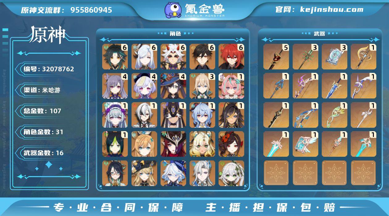 60级/107黄/男主/31个五星角色/16个五星武器 1命阿蕾奇诺,0命千织,0命闲云,0命娜维娅,0命芙宁娜,0命那维莱特,1命迪希雅,0命纳西妲,1命赛诺,1命提纳里,满命申鹤,满命荒泷一斗,0命枫原万叶,满命钟离,1命甘雨,满命魈,0命宵宫,0命温迪,4命刻晴,4命七七,3命琴,4命莫娜,满命迪卢克,0命希诺宁,0命恰斯卡,1命梦见月瑞希,1命瓦雷莎,0命爱可菲,0命丝柯克,0命菲林斯,0命法尔伽,精1裁断,精1猎人之径,精1息灾,精5赤角石溃杵,精1终末嗟叹之诗,精1飞雷之弦振,精1松籁响起之时,精3四风原典,精3和璞鸢,精1天空之脊,精1阿莫斯之弓,精1天空之刃,精1斫峰之刃,精1天空之卷,精1风鹰剑,精1天空之傲