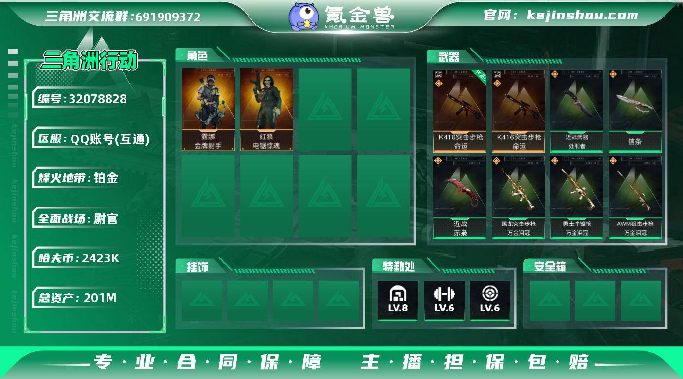 【热门皮肤号:双刀皮+一典藏-信条+赤枭.总资产200M】【Q区三端互通】【无二次】YXz8578-特勤处:仓库8级/靶场6级/训练中心6级-总资产201.2m-哈夫币242w-烽火等级:60级 【干员外观】:红狼-电锯惊魂,露娜-金牌射手 【近战皮肤】:近战-信条,近战-赤枭,近战-处刑者,近战-黑鹰 【典藏外观】:K416突击步枪-命运 【典藏外观成色】:K416突击步枪-命运(优品C) 【传说外观】:M4A1突击步枪-阿米娅,ASh-12战斗步枪-鹅鸭杀,SG552突击步枪-运动员,AK-12突击步枪-特斯拉线圈,SCAR-H战斗步枪-启航,CAR-15突击步枪-阿米娅,腾龙突击步枪-万金泪冠,KC17突击步枪-电锯惊魂,P90冲锋枪-信条,Vector冲锋枪-能天使-午夜邮差,UZI冲锋枪-特斯拉线圈,SR-3M紧凑突击步枪-特斯拉线圈,勇士冲锋枪-能天使-午夜邮差,勇士冲锋枪-万金泪冠,QCQ171冲锋枪-鹅鸭杀,QJB201轻机枪-鹅鸭杀,M14射手步枪-蛮荒,SKS射手步枪-骑士,SR-25射手步枪-信条,AWM狙击步枪-万金泪冠 【史诗外观】:PTR-32突击步枪-碎冰行动,K416突击步枪-冬日风情,K416突击步枪-腊梅,M7战斗步枪-百步穿杨,SCAR-H战斗步枪-囚徒,G3战斗步枪-流沙送葬,PTR-32突击步枪-工业狂潮,AS Val突击步枪-百步穿杨,腾龙突击步枪-猎鳄行动,腾龙突击步枪-聚光灯,MP5冲锋枪-战术竞备,MP5冲锋枪-竞技风,Vector冲锋枪-阿萨拉文明,Vector冲锋枪-猎鳄行动,Vector冲锋枪-百步穿杨,Vector冲锋枪-异域战争,SR-3M紧凑突击步枪-战术竞备,M870霰弹枪-聚光灯,M249轻机枪-丛影谍踪,M250通用机枪-囚徒,QJB201轻机枪-炽焰,VSS射手步枪-丛影谍踪,M14射手步枪-工业狂潮, M14射手步枪-航天庆典,SR-25射手步枪-聚光灯,M700狙击步枪-竞技风,M700狙击步枪-百步穿杨,AWM狙击步枪-流沙送葬,沙漠之鹰-曙光 【稀有外观】:M14射手步枪-花岗岩,SG552突击步枪-巨兽,M4A1...