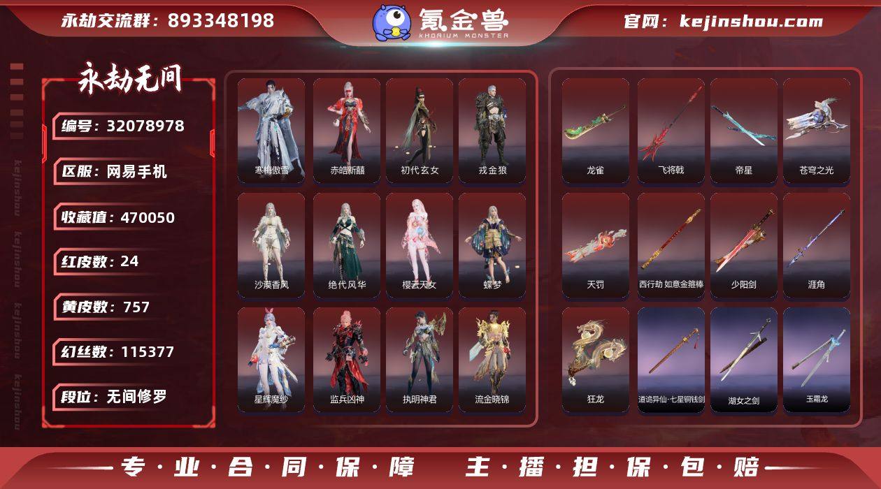 红皮数:24 黄皮数:757 等级:507 幻丝数:115377 收藏值:470050 段位:无间修罗 通行证:已升级 征神通行证:未升级 版本:终极版 网易支付状态:可注销 换绑冷却:无冷却 是否绑定手游账号:已绑定手游 是否支持人脸包赔:不支持 寒梅傲雪,赤皓新囍,初代玄女,戎金狼,沙漠香风,绝代风华,樱云天女,蝶梦,星辉魔纱,监兵凶神,执明神君,流金晓锦,逐光者,画中仙,征天白龙 龙雀,帝星,飞将戟,苍穹之光,天罚,西行劫·如意金箍棒,少阳剑,涯角,狂龙 卖家说:征神同修,法宝三个赛季都有