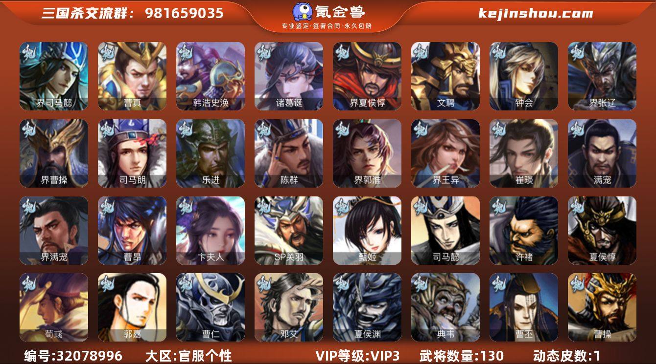 官阶: 校尉 VIP等级: VIP3 武将数量: 130 动态皮肤数量: 1 魏国武将: 张辽,SP关羽,SP贾诩,卞夫人,曹昂,曹操,曹丕,曹仁,界满宠,满宠,郭嘉,荀彧,崔琰,界王异,界郭淮,陈群,乐进,夏侯惇,司马朗,界曹操,许褚,界张辽,钟会,文聘,曹彰,界夏侯惇,诸葛诞,司马懿,甄姬,徐晃,韩浩史涣,曹真,典韦,夏侯渊,于禁,邓艾,界司马懿 蜀国武将: 花鬘,界关羽,赵云,张松,彭羕,界刘备,刘封,黄月英,关羽,吴懿,张飞,魏延,界法正,糜夫人,刘禅,界赵云,SP孙尚香,SP徐庶,周仓,界关兴张苞,诸葛亮,法正,界马岱,关平,庞统,马谡,马超,廖化,关兴张苞,孟获,黄忠,刘备,界马超,蒋琬费祎,彭羕(国战) 吴国武将: 界徐盛,周泰,吕蒙,丁奉,界全琮,顾雍,孙翊,孙尚香,大乔,韩当,陆逊,诸葛瑾,吕范,界黄盖,孙鲁班,界周瑜,孙权,界甘宁,甘宁,界大乔,孙坚,孙鲁育,周瑜,小乔,潘璋马忠,黄盖,孙策,界陆逊,徐盛,张昭张纮,朱桓 群国武将: 杜预,张让,伏完,华雄,董白,袁术,界庞德,于吉,吕布,李儒,公孙瓒,王濬,蔡夫人,界袁术,贾诩,庞德,谋卢植,张角,袁绍,华佗,貂蝉,伏皇后,颜良文丑,谋高顺,马腾,田丰,友庞统