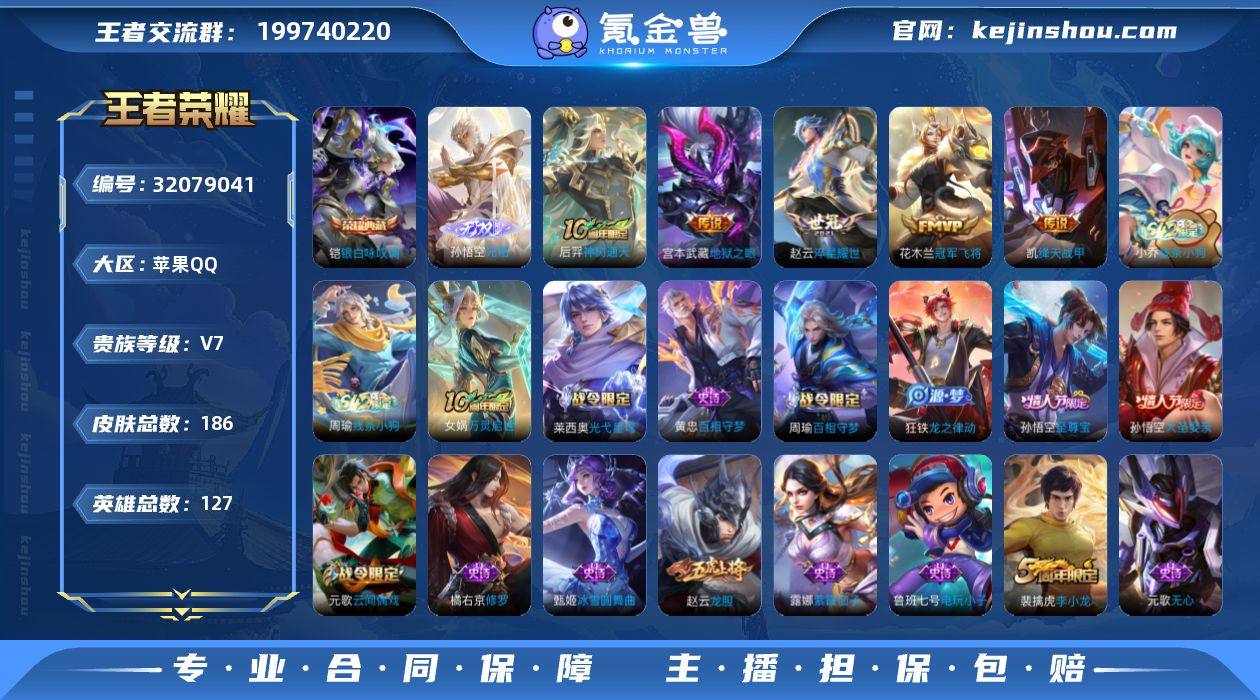实名: 可修改 贵族等级: V7 英雄数: 127 皮肤数: 186 荣耀水晶: 银白咏叹调 无双皮: 无相 传说皮: 冠军飞将,绛天战甲,地狱之眼,淬星耀世,神树通天 限定皮: 李小龙,梁祝,龙胆,热情桑巴,至尊宝,大圣娶亲