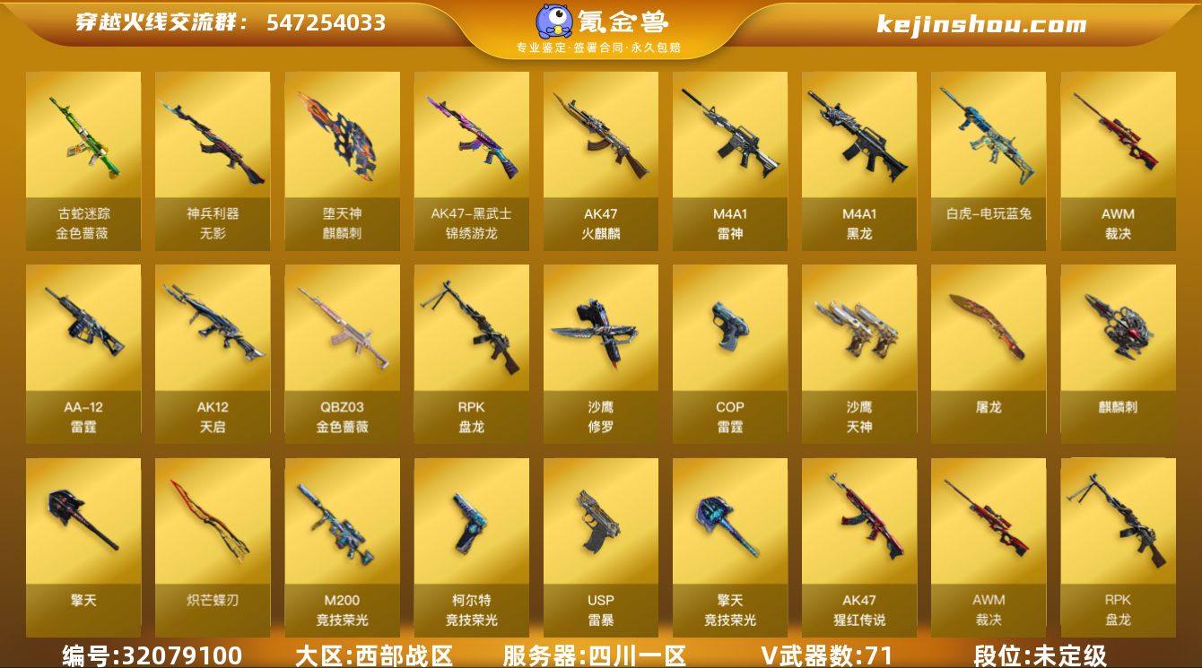 四川一区-78V-5王者-0炫金 【传说角色】:传说星骇 【热门武器】:QBZ03-金色蔷薇,金色蔷薇-古蛇迷踪,修罗-古蛇迷踪,M200-竞技荣光,死亡之眼,白虎-电玩蓝兔,RPK-盘龙,USP-雷暴,沙鹰-修罗,炽芒蝶刃,炽芒蝶刃-破浪逐光 皮肤 【王者炫金武器】:王者森力 【音效卡】:修罗-古蛇迷踪音效卡,M4A1-雷神音效卡,M14EBR-玄武音效卡,Barrett-碧霄极光音效卡,麒麟刺-百战金芒-盛典舞曲音效卡,白虎-盛典舞曲音效卡,炼狱-百战金芒-庆典舞曲音效卡,死神-雪域霜狐-怀旧音效卡 【皮肤】:幻神-电竞之星 皮肤,金色蔷薇-纸灯龙皮肤,金色蔷薇-电竞之星 皮肤,裁决-流光秘银,雷神-宇航兔皮肤,雷神-维纳斯皮肤,M4A1-再燃火线,毁灭-暗月,毁灭-百城浙江 皮肤,毁灭-雪域霜狐 皮肤,M4A1-千变-孔明皮肤,黑龙-能量核心,超新星-深海萌鲨 皮肤,屠龙-春桃 皮肤,屠龙-惊鸿 皮肤,轻型军用手斧-再燃火线,擎天-蒸汽钟表 皮肤,麒麟刺-月皮肤,炽芒蝶刃-破浪逐光 皮肤 【角色】:零,电竞教官-云悠悠,关小雨,玄豹,战地猎狐,王者-魅影,王者鹰,雪域霜狐,蛇隐宗,乔伊教练,修道士,暗夜-X,芳心审判者,飞虎队-X,风暴女,虎妞,娟娟,兰-新年限定,兰妹妹,猎狐者-追月,0号玩家,灵狐者-X,龙儿,麻雀,潘多拉-X,潘多拉-甜心教官,蛇姬,斯沃特-X,蜀雪 【人偶武器】:迷你宝贝,异变清道夫-蛇影双骄,AWM-灵狐-15周年嘉年华,M37-葵,COP-旗袍,迷你深渊冰龙,迷你裂空之翼,迷你牛牛,生化手雷-机甲核心*3,迷你艾比,迷你超能女侍 【暴走生化】:死亡之眼,超级对讲机 【挑战大师】:暴君乱世-超越Max,冰龙粉碎者-白马银枪,激光毁灭者III,试炼破坏者III,KAC-圣炎切割者III,神圣爆裂者-末日III,阐释者III*2 【英雄级武器】:AK47-火麒麟,M4A1-黑龙,M4A1-雷神,AK12-天启,无影-神兵利器,黑武士-锦...