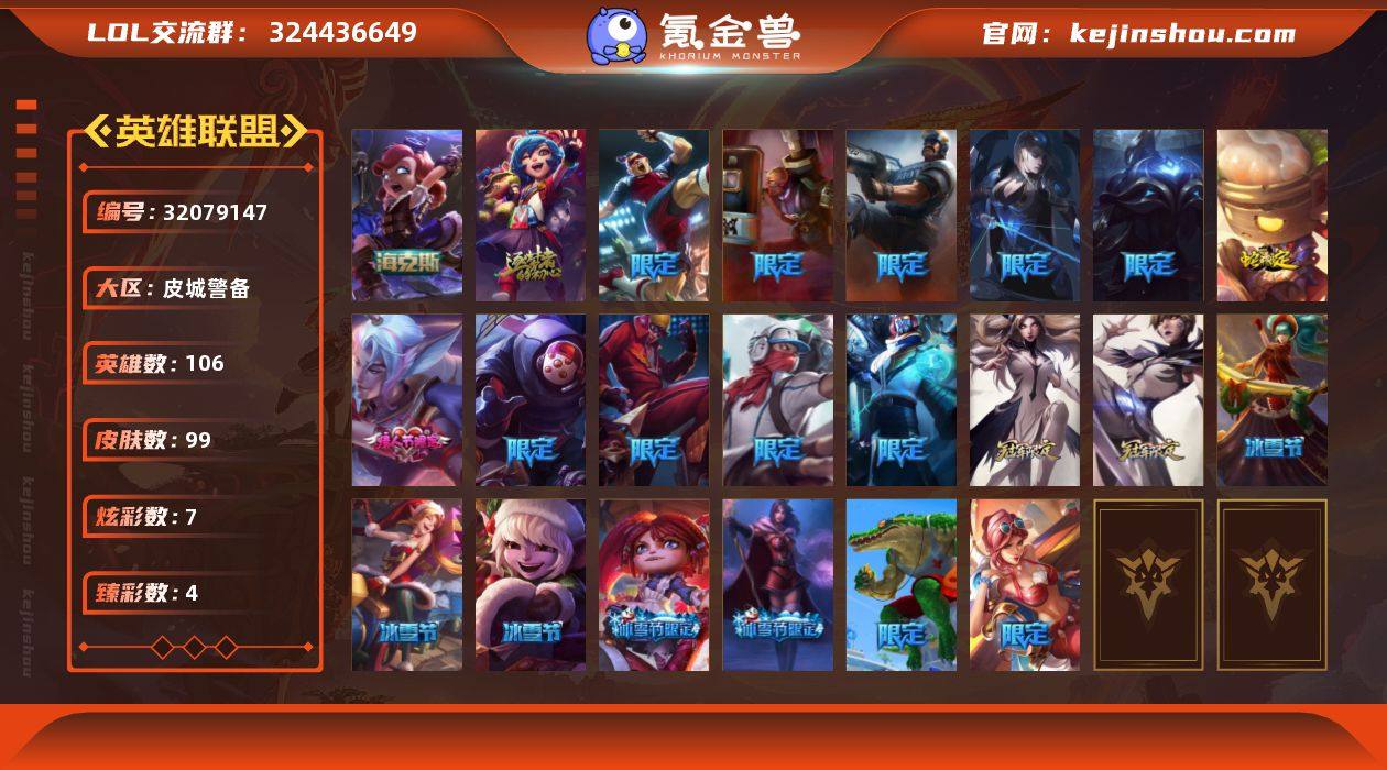 【LD5174】106英雄/99皮肤/3神话/24限定/4臻彩/7炫彩/9传说/18史诗/未定级账号等级:89/10周年 安妮/海克斯 安妮/至臻永恒星灵佐伊/西部魔影 卢锡安 贝利尔之怠/黎明使者 锐雯 黑夜使者/星之守护者 萨勒芬妮 未来之光/点心宝贝 阿木木/甜心之翎 洛/幸福女神 乐芙兰/圣诞精灵 崔丝塔娜/平安夜女神 娑娜/圣诞玩偶 波比/雪球也能爆炸 吉格斯/圣诞捣蛋鬼 金克丝/冠军之隐 劫/冠军之箭 艾希/S3 SKT T1 贾克斯/S3 SKT T1 李青/S4 SSW 炼金/S5 SKT T1 瑞兹/S8 IG 艾瑞莉娅/S8 IG 卡密尔/暗裔英雄 盖伦/海贼 瑞兹/无头骑士 赫卡里姆/泳池派对 雷克顿/制胜金靴 李青/防暴士兵 格雷福斯/防暴士兵 辛吉德/海之歌 艾希/驯龙炮手 崔丝塔娜/黯晶凤凰 艾尼维亚/冰霜之刃 艾瑞莉娅/源计划:净化 薇恩/黎明使者 锐雯/宇航员 诺提勒斯/神王 德莱厄斯/黑夜使者 亚索/神龙尊者 夜月幻龙 亚索/科学怪熊的新娘 安妮/绞肉机角斗士 赵信/地狱火 阿利斯塔/百夫长 贾克斯/绝代智将 斯维因/沙漠风暴 卡特琳娜/四神之力 乌迪尔/血色之锤 波比/刺客信条 凯南/刺客信条 锐雯/血色精锐 锐雯/仲裁圣女 辛德拉/源计划: 风 亚索/腥红之月 亚索/时之砂 艾克/霓虹杀拳 蔚/炼狱魔女 蔚/星际之门 阿兹尔/霹雳游侠弗拉基米尔/亮丽女神希维尔/幽蓝梦魇加里奥/未来战士崔斯特/奥德赛崔斯特/幽魂费德提克/至高天凯尔/部落精神瑞兹/宗师级法师训练师瑞兹/孤勇之隐瑞兹/腥红之月希维尔/灵魂莲华提莫/勇敢的心艾希/宗师级钓鱼训练师贾克斯/武神贾克斯/嘻哈精神基兰/横行霸道图奇/联盟之喙艾尼维亚/恐怖之源萨科/日冕女神卡尔玛/光明骑士卡尔玛/灰胡子魔法师维迦/里尔击球手特朗德尔/双城之战凯特琳/三叶草墨菲特/猛龙雷克顿/猎天使魔女薇恩/机神斯卡纳/单身贵族内瑟斯/法国女仆奈德丽/狂热球迷古拉加斯/刺身之拳阿卡丽/宇航员凯南/战神阿瑞斯盖伦/神圣守卫蕾欧娜/...