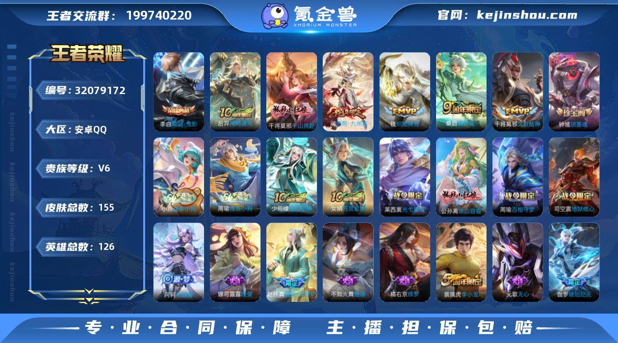 无二次-安卓Q-V6-至尊星耀IV段位-126英雄-155皮肤-1典藏皮肤-6传说-48史诗 【荣耀典藏】:李白鸣剑曳影 【传说皮肤】:后羿神树通天,干将莫邪千山共赴,澜愿照九州拓,桑启鸣野蒿,镜炽阳神光,干将莫邪久胜战神 【限定皮肤】:虞姬夏日便利店,狄仁杰阴阳师,赵云皇家上将,孙尚香蔷薇恋人,元歌无心,狄仁杰魔术师,达摩沙漠行僧,项羽海滩派对,兰陵王金庭之子,李元芳云中旅人,鬼谷子五谷丰年,沈梦溪大漠名商,裴擒虎李小龙,裴擒虎擒涛扼浪,云中君纤云弄巧,嫦娥拒霜思,鲁班大师探海日志,桑启海盐诗旅,艾琳流音漫舞,司空震地狱燃心,阿古朵江河有灵,张良古海寻踪,蒙犽百解令,蒙恬荣光圣徽,鬼谷子天穹祈灯,伽罗琥珀纪元,刘邦剑破天穹 【年限皮肤】:澜愿照九州拓 【赛季限定】:达摩沙漠行僧,兰陵王金庭之子,沈梦溪大漠名商,李元芳云中旅人,桑启海盐诗旅,裴擒虎擒涛扼浪,鲁班大师探海日志,张良古海寻踪,鬼谷子天穹祈灯,刘邦剑破天穹,东皇太一噬灭天穹,太乙真人谧流熔炉,甄姬逆浪荇歌,亚瑟荣光之誓,蒙恬荣光圣徽 【战令限定】:司空震地狱燃心,艾琳流音漫舞,虞姬夏日便利店,周瑜百相守梦,孙策百相守梦,莱西奥光弋星穹,明世隐往忆晖光,周瑜线条小狗,小乔线条小狗 【史诗皮肤】:钟馗锁墨魂,周瑜线条小狗,小乔线条小狗,少司缘巫礼祀神,女娲万灵启世,莱西奥光弋星穹,公孙离涂山容容,周瑜百相守梦,阿轲化蝶舞,赵怀真器灵浮梦炉,伽罗琥珀纪元,蒙恬荣光圣徽,蒙犽百解令,阿古朵江河有灵,司空震地狱燃心,刘禅电玩爆裂旋风,元歌无心,鬼谷子五谷丰年,嫦娥拒霜思,云中君纤云弄巧,裴擒虎李小龙,橘右京修罗,不知火舞魅语,娜可露露晚萤,狄仁杰鹰眼统帅,阿轲节奏热浪,白起星夜王子,李元芳逐浪之夏,刘禅天才门将,蔡文姬舞动绿茵,安琪拉心灵骇客,兰陵王暗隐...