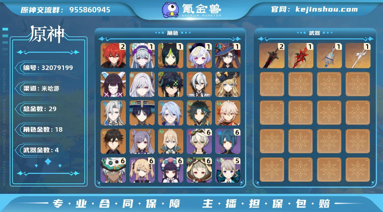 邮箱: 未绑定 总黄数: 29 冒险等级: 57 2命金色角色: 二命迪卢克 1命金色角色: 一命七七,一命莫娜,一命提纳里,一命梦见月瑞希 0命金色角色: 枫原万叶,刻晴,钟离,琴,魈,神里绫人,流浪者,那维莱特,娜维娅,阿蕾奇诺,基尼奇,丝柯克,哥伦比娅 拥有武器: 狼的末路,风鹰剑,图莱杜拉的回忆,赤月之形 2精武器: 狼的末路 1精武器: 风鹰剑,图莱杜拉的回忆,赤月之形