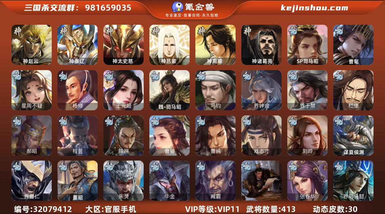 官阶: 大将军 VIP等级: VIP11 武将数量: 413 动态皮肤数量: 30 神将: 神太史慈,神张辽,神赵云,神吕蒙,神周瑜,神诸葛亮 魏国武将: 刘晔,戏志才,曹纯,曹婴,陈琳,程昱,郝昭,嵇康,界于禁,界钟会,马钧,魏-司马昭,王元姬,杨修,唐咨-魏,张辽,SP蔡文姬,SP曹仁,SP关羽,SP贾诩,SP姜维,SP庞德,卞夫人,蔡贞姬,曹昂,曹操,曹冲,曹洪,曹丕,曹仁,曹叡,王异,张恭,鲁芝,界满宠,曹休,界曹植,满宠,荀攸,王基,钟繇,蒯越蒯良,郭嘉,荀彧,阮慧,杜畿,界郭嘉,崔琰,界曹丕,界荀彧,朱灵,界甄姬,吕虔,界陈群,界王异,界许褚,界郭淮,华歆,陈群,界邓艾,界典韦,界曹休,李通,乐进,辛宪英,郭淮,界曹彰,郭皇后,毌丘俭,夏侯惇,曹植,司马朗,界曹操,星周不疑,许褚,界张辽,谋徐晃,张郃,钟会,文聘,曹彰,界夏侯惇,诸葛诞,司马懿,甄姬,界徐晃,徐晃,界曹仁,孙资刘放,韩浩史涣,胡班,曹真,典韦,界夏侯渊,夏侯渊,李典,于禁,王双,邓艾,界司马懿,张春华,孟达-魏,臧霸,牛金,朱灵(国战),曹髦,SP司马昭,董昭,谋夏侯渊 蜀国武将: 董允,关索,界黄忠,谯周,沙摩柯,王平,张星彩,赵襄,诸葛瞻,谋马超,马云騄,徐庶,界魏延,杨仪,吕凯,界关羽,界诸葛亮,邓芝,界伊籍,胡金定,费祎,严颜,界黄月英,界张嶷,赵云,张松,彭羕,李丰,界刘备,界刘禅,刘封,糜竺,谋庞统,黄月英,关羽,王甫赵累,吴懿,界廖化,向宠,祝融,张飞,黄皓,魏延,界周仓,马忠,界法正,糜夫人,界孟获,刘禅,界赵云,界姜维,张翼,关银屏,界祝融,SP孙尚香,SP徐庶,卧龙诸葛,宗预,周仓,简雍,界关兴张苞,诸葛亮,孙乾,界张飞,界卧龙诸葛,法正,界简雍,赵统赵广,陈到,界马岱,关平,马岱,界庞统,庞统,诸葛果,谋张飞,马谡,马超,廖化,关兴张苞,孟获,秦宓,吴苋,夏侯氏,姜维,黄忠,刘备,界马超,李严,马良,傅肜,蒋琬费祎,刘谌,彭羕(国战),甘夫人,蜀-糜芳傅士仁,势陈到 吴国武将: 贺齐,界步练师,界徐盛,界朱然,留赞,骆统,孙皓,周处,潘濬,陆绩,张温,...
