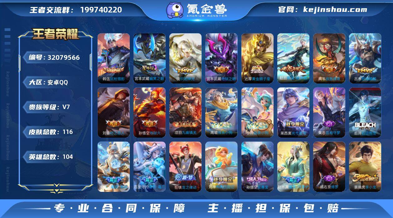 安卓Q-V7-最强王者段位-104英雄-116皮肤-1典藏皮肤-1珍品传说-9传说-35史诗【英雄全皮】:孙权全皮,敖隐全皮【荣耀典藏】:韩信弑枪猎影【珍品传说】:伽罗沧流箭【传说皮肤】:狄仁杰神骥赴朔漠,典韦战鼓燎原,赵云乘龙铭钟鼎,吕布怒海麟威,镜炽阳神光,刘备时之恋人,达摩黄金狮子座,宫本武藏地狱之眼,孙悟空地狱火【限定皮肤】:狄仁杰阴阳师,赵云皇家上将,元歌无心,狄仁杰魔术师,项羽海滩派对,孙悟空至尊宝,牛魔御旌,钟馗驱傩正仪,女娲朔望之晖,雅典娜单词大作战,鬼谷子原初探秘者,裴擒虎李小龙,上官婉儿梁祝,蒙犽狂想玩偶喵,赵云乘龙铭钟鼎【年限皮肤】:赵云乘龙铭钟鼎【赛季限定】:牛魔御旌,鬼谷子原初探秘者,钟馗驱傩正仪,钟馗虚灵犬护,甄姬逆浪荇歌,亚瑟荣光之誓,项羽九幽镇关【战令限定】:女娲朔望之晖,蒙犽狂想玩偶喵,雅典娜单词大作战,刘禅鸭鸭历险记,沈梦溪鸭鸭历险记,莱西奥光弋星穹,明世隐往忆晖光,周瑜线条小狗,小乔线条小狗【史诗皮肤】:达摩星君亢金,盘古撼世英歌,周瑜线条小狗,小乔线条小狗,项羽九幽镇关,莱西奥光弋星穹,黄忠百相守梦,后羿石田雨龙,老夫子藏狐褐绒,百里守约雪豹霜爪,狂铁龙之律动,刘禅鸭鸭历险记,赵怀真器灵浮梦炉,元歌无心,哪吒雪上飞焰,司马懿暗渊魔法,杨戬天秀启明,裴擒虎李小龙,蒙犽狂想玩偶喵,橘右京修罗,上官婉儿梁祝,狄仁杰鹰眼统帅,蔡文姬舞动绿茵,铠曙光守护者,夏侯惇乘风破浪,孙悟空至尊宝,李白千年之狐,曹操幽灵船长,吕布圣诞狂欢,妲己女仆咖啡,妲己魅力维加斯,孙尚香水果甜心,宫本武藏鬼剑武藏,狄仁杰魔术师,王昭君偶像歌手,赵云皇家上将【其他皮肤】:鲁班七号班班快跑,桑启线条小狗,虞姬溯影追猎,蚩奼极光幻客,曹操逐霄之志,艾琳鹤鸣心笺,孙权径山谋武,明世隐往忆晖光,亚瑟荣...