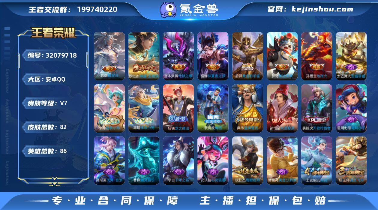 贵族等级:V7 典藏皮肤数:0 珍品无双皮肤数:0 无双皮肤数:0 珍品传说皮肤数:0 传说皮肤数:7 史诗皮肤数:23 皮肤数:82 英雄数:86 段位:绝世王者