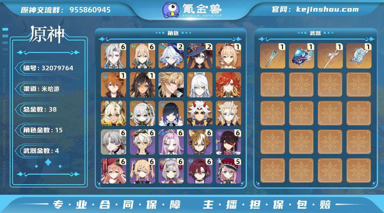 冒险等级:60 总黄数:38 5星角色数:15 5星武器数:4 原石数量:143 相遇之缘数量:0 纠缠之源数量:0 6命那维莱特,6命琴,2命芙宁娜,2命莫娜,1命宵宫,1命达达利亚,1命迪希雅,0命法尔伽,0命兹白,0命玛薇卡,0命希诺宁,0命纳西妲,0命夜兰,0命荒泷一斗,0命阿贝多 6命叶洛亚,6命爱诺,6命班尼特,6命北斗,6命菲谢尔,6命鹿野院平藏,6命诺艾尔,6命五郎,6命烟绯,5命夏洛蒂,5命重云,5命瑶瑶,4命赛索斯,4命行秋,4命珐露珊,4命坎蒂丝,4命柯莱,4命辛焱,3命香菱,3命芭芭拉,3命九条裟罗,2命嘉明,2命绮良良,2命多莉,2命雷泽,2命丽莎,2命米卡,2命砂糖,2命托马,1命欧洛伦,1命夏沃蕾,1命伊安珊,1命迪奥娜,1命卡维,1命罗莎莉亚,1命莱依拉,1命云堇,0命菲米尼,0命久岐忍,0命卡齐娜,0命琳妮特,0命塔利雅,0命伊法,0命安柏,0命凯亚,0命凝光,0命早柚 精1狼的武功歌,精1万世流涌大典,精1风鹰剑,精1四风原典 100%侦察骑士,古恩希尔德的传承,星与月之约,致教会自由人 卖家说:邮箱未绑定,接受小刀,刀太多没意思