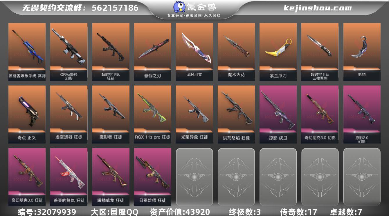 【自带包赔 可赔三倍】:库存价值43920 限定怜悯+盖亚 流脓 日冕 超时空等热门主战 性价比超值 【限定】: 无畏契约季前邀请赛 悲悯之刃 【近战】: 紫金爪刀, 无畏契约季前邀请赛 悲悯之刃, 流风回雪, 超时空卫队 三棱军刺, 魔术火花, 影钩 【狂徒】: 噬影者 狂徒, RGX 11z Pro 狂徒, 日冕雄师 狂徒, 虚空遗器 狂徒, 洪荒怒焰 狂徒, 盖亚的复仇 狂徒, 光荣异象 狂徒, 奇幻朋克//3.0 狂徒, 超时空卫队 狂徒, 耀鳞威龙 狂徒 【幻影】: ORA x 颗秒 幻影, 奇幻朋克//3.0 幻影, 掠影//2.0 幻影 【冥驹】: 源能者娱乐系统 冥驹 【正义】: 奇点 正义 【戍卫】: 掠影 戍卫 【概要】: 总皮肤 86 终极 3 传奇 17 卓越 7 刀皮 英雄 28 LV 154 历史最高:钻石 当前段位:超凡一 已使用 1120 R点 剩余 0 R点 不可二次 卡面、挂饰、其他皮肤请看截图 道具、段位等以实际验号为准。如账号因没有维护,赛季更新等不可抗因素发生变化,不属于账号质量问题"