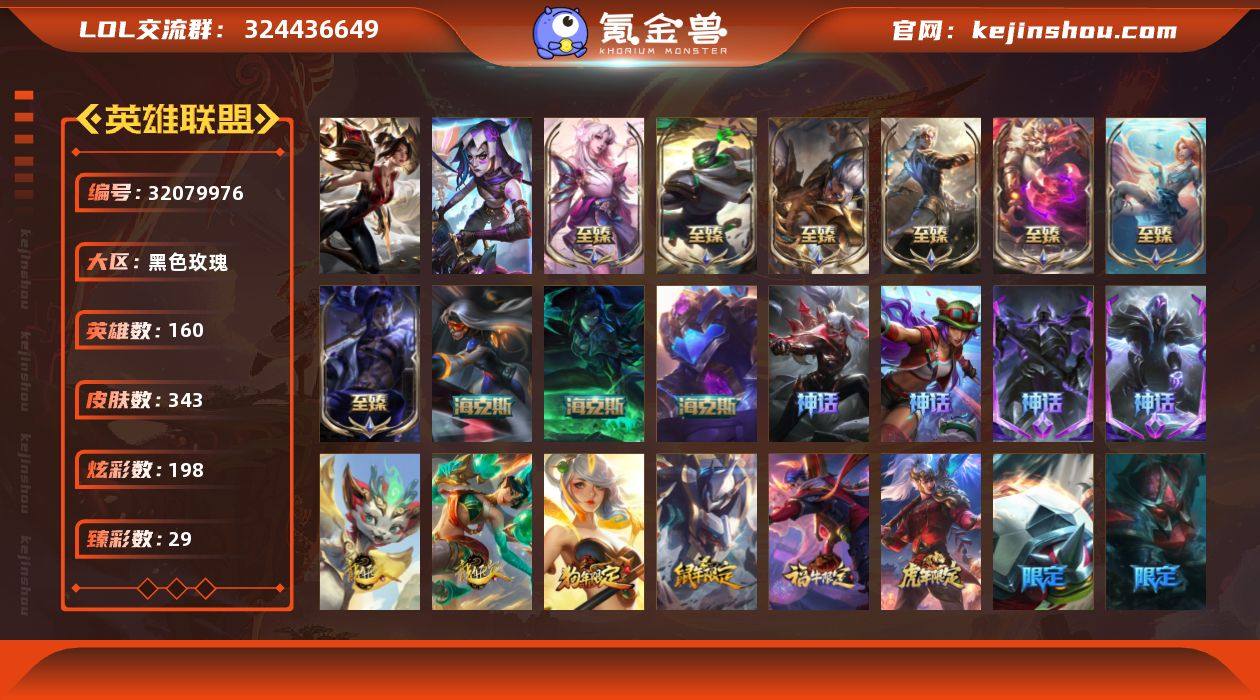 【LDC2720】160英雄/343皮肤/15神话/52限定/29臻彩/198炫彩/56传说/37史诗/大师账号等级:321/双城之战2 破碎者 金克丝/十五周年纪念 希维尔/殿堂传奇 薇恩/灰烬骑士 莫德凯撒/灰烬骑士 派克/海克斯 拉莫斯/摄魂 薇恩/海克斯 希维尔/至臻 征服者 贾克斯/至臻 海之歌 萨勒芬妮/至臻 黑夜使者 凯隐/至臻 墨之影武者 亚索/至臻 神龙尊者均衡之龙 沃利贝尔/至臻 神龙尊者 炎龙瑟提/爱情之歌/殿堂传奇 卡莎/至臻 暗裔英雄 嘉文四世/至臻 灵魂莲华 拉克丝/天龙之子 卡莎 飞龙乘云/巅峰剑仙 菲奥娜 天神下凡/无畏圣弩 薇恩 绝境狂杀/无畏骑士 瑟庄妮 赤子初心/赵云 子龙 炫金将军/神龙尊者 圣龙李青 龙腾云起/玉剑传说 无影 竞星/黎明使者 锐雯 黑夜使者/星之守护者 金克丝 黑洞/灵魂莲华 卡西奥佩娅 流火/灵魂莲华 锐雯 流火/星之守护者 卡莎 热情之光/玉剑传说 寒潭夭夭 胭脂/破败军团 厄运小姐 灵岛征伐使/灵魂莲华 亚索 霜见之时/可爱可爱粉红红 布里茨/星之守护者 阿卡丽 热情之光/魔女 阿卡丽 虚荣/魔女 阿狸 饕餮/净雪之月 莫甘娜 冬虹/春晖神女 拉克丝/王国机神苍狼 瑟提/福牛守护者 厄斐琉斯/猛虎下山 赵信/天龙之子 卡莎/天龙之子 斯莫德/觅心猫猫 悠米/圣诞狂欢 时光/胡桃夹子 小丑/冰雪节 茂凯/冰雪驯鹿 波比/魄罗骑士 瑟庄妮/钢铁军团 拉克丝/冠军典狱长 锤石/冠军掠夺者 卡兹克/S2 暗杀星 蒙多/S2 暗杀星 努努/S2 暗杀星 伊泽瑞尔/S6 SKT T1 扎克/S7 SSG 纳尔/S7 SSG 塔利亚/SSG霞/S8 IG 菲奥娜/S8 IG 艾瑞莉娅/S8 IG 卡莎/S8 IG 乐芙兰/S10 DWG 凯南/S11 EDG 佛耶戈/S11 EDG 厄斐琉斯/S12 DRX 亚托克斯/玉剑传说无影/12周年 泽丽/暗裔英雄 盖伦/胜利凤凰 艾尼维亚/胜利之运 崔斯特/胜利女神-菲奥娜/魅惑女巫 菲奥娜/泳池派对 嘉文四世/泳池派对 佐伊/破空枪骑 孙悟空/野兽猎人 泰达米尔/波比的巧克力工坊/...