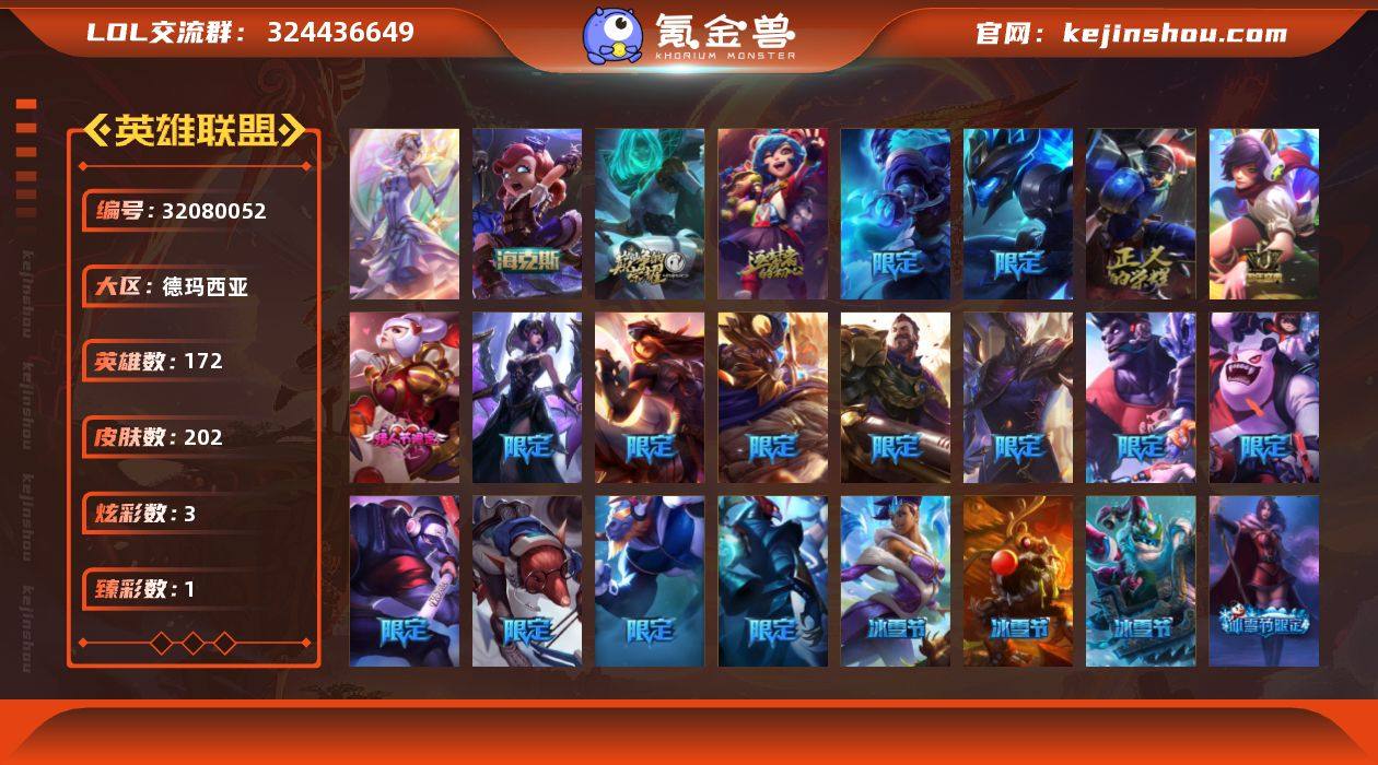 【LDC2714】172英雄/202皮肤/1终极/3神话/23限定/1臻彩/3炫彩/28传说/70史诗/未定级账号等级:174/10周年 安妮/源代码 乐芙兰/海克斯 安妮/海之歌 艾希 冰爽浪花/觅心魔灵 奥利安娜/幸福女神 乐芙兰/圣诞狂欢 努努/冬季仙境 卡尔玛/邪恶圣诞老人 维迦/圣诞驯鹿 克格莫/大元素使/冠军典狱长 锤石/冠军之矛 卡莉丝塔/S2 暗杀星 蒙多/S2 暗杀星 努努/S2 暗杀星 慎/S4 SSW 图奇/S5 SKT T1 阿利斯塔/S5 SKT T1 阿兹尔/5周年 阿狸/暗裔英雄 盖伦/胜利女神 莫甘娜/胜利女神 希维尔/胜利之树 茂凯/胜利枪神 格雷福斯/胜利之剑 亚托克斯/魅惑女巫 莫甘娜/防暴天使 凯尔/战地机甲 厄加特/邪鸦魅影 乐芙兰/血石领主 弗拉基米尔/钢铁之翼 凯尔/恶魔男爵 瑞兹/约德尔国队长 提莫/欧米伽小队 幽灵特工/驯龙炮手 崔丝塔娜/源计划:联合 艾希/恶魔之刃 泰达米尔/鬼魂新娘 莫甘娜/战地巨兽 科加斯/黯晶凤凰 艾尼维亚/最终BOSS 维迦/苹果机器人 布里茨/上古战魂 魔腾/丧尸 布兰德/银河魔装机神 兰博/第三类接触 黑默丁格/腥红之月 鬼武姬 阿卡丽/死亡骑士 盖伦/星之守护者 拉克丝/枯萎之壤 泽拉斯/黯黑魔龙 希瓦娜/偶像歌手 阿狸/苍穹之光 韦鲁斯/金牌主播 德莱文/星之守护者 金克丝/冰霜烈焰 安妮/安伯斯与提妮/科学怪熊的新娘 安妮/皇家火炮手 崔斯特/摄魂男爵 弗拉基米尔/重生之沙 费德提克/源代码 索拉卡/女船长 厄运小姐/死神 卡尔萨斯/殇之机器人 阿木木/贵族血统 萨科/五杀摇滚键盘手 娑娜/掠星魔刃 卡萨丁/寒冰女皇 迦娜/穿着正装的恶魔 维迦/绝代智将 斯维因/铁血狙击手 凯特琳/霸天巨兽 墨菲特/暗夜猫女 卡特琳娜/前线指挥官 卡特琳娜/源计划:雄心 卡特琳娜/蓝焰梦魔 魔腾/V字仇杀者 布兰德/冰晶之核 布兰德/灵魂烈焰 布兰德/深海妖姬 卡西奥佩娅/艳后 奈德丽/铁血猎手 奈德丽/钢铁意志 潘森/大夏武士 潘森/实习护士 阿卡...