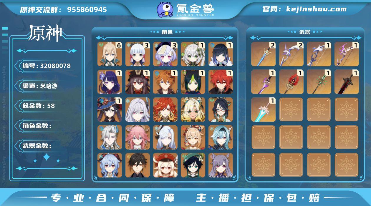 【原神】冒险等级:60,五星数量:36,五星角色:琴 * 6命,七七 * 3命,神里绫华 * 3命,达达利亚 * 1命,迪卢克 * 1命,胡桃 * 1命,雷电将军 * 1命,莫娜 * 1命,夜兰 * 1命,提纳里 * 1命,纳西妲 * 1命,希诺宁,温迪,玛薇卡,宵宫,优菈,钟离,申鹤,八重神子,那维莱特,闲云,丝柯克,甘雨,可莉,刻晴__五星武器:阿莫斯之弓 * 2精,苍古自由之誓 * 2精,飞雷之弦振,和璞鸢,护摩之杖,狼的末路,天空之傲,雾切之回光,若水__四星角色:班尼特 * 6命,行秋 * 6命,香菱 * 6命,久岐忍 * 6命,鹿野院平藏 * 6命,珐露珊 * 6命,凝光 * 6命,迪奥娜 * 6命,砂糖 * 6命,柯莱 * 6命,芭芭拉 * 6命,云堇 * 6命,托马 * 6命,烟绯 * 6命,重云 * 6命,辛焱 * 6命,诺艾尔 * 6命,罗莎莉亚 * 6命,雷泽 * 6命,菲谢尔 * 6命,北斗 * 6命,多莉 * 5命,早柚 * 5命,九条裟罗 * 4命,莱依拉 * 3命,五郎 * 3命,卡齐娜 * 2命,嘉明 * 2命,米卡 * 1命,坎蒂丝 * 1命,琳妮特 * 1命,埃洛伊,奇偶·女性,瑶瑶,卡维,蓝砚,菲米尼,夏沃蕾,伊法,赛索斯