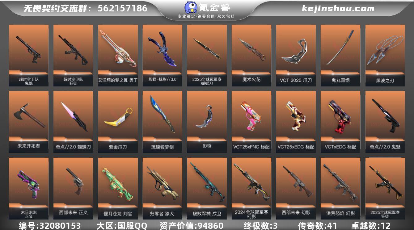 【自带包赔 可赔三倍】:库存价值 94860限定24幻影 25套装 VCT爪刀多热门主战皮肤 皮肤精炼!可二次。清仓急出,可小刀,诚心要可谈! 【限定】: 2025全球冠军赛 狂徒, 2025全球冠军赛 蝴蝶刀, VCT 2025 爪刀, 2024全球冠军赛 幻影 【近战】: 影蝶, 2025全球冠军赛 蝴蝶刀, 黑波之刃, 魔术火花, 影钩, 紫金爪刀, 鬼丸国纲, VCT 2025 爪刀, 未来开拓者, 奇点//2.0 蝴蝶刀, 琉璃锻梦剑 【狂徒】: 2025全球冠军赛 狂徒, 超时空卫队 狂徒, 混沌序曲 狂徒, 紫阙金琅 狂徒, 奇点//2.0 狂徒, 洪荒怒焰 狂徒, 塑水宗 狂徒, 耀鳞威龙 狂徒, 全息波普//2.0 狂徒, 盖亚的复仇 狂徒 【幻影】: 异鳞魔蛇 幻影, 掠影//2.0 幻影, 侦察力量 幻影, 西部未来 幻影, 洪荒怒焰 幻影, 2024全球冠军赛 幻影 【冥驹】: 归零者 冥驹, 千灵华绽 冥驹 【正义】: 掠影//3.0 追猎, 末日泡泡 正义, 西部未来 正义 【戍卫】: 天界神兵 戍卫, 破败军械 戍卫 【獠犬】: 归零者 獠犬 【鬼魅】: 天界神兵 鬼魅, 掠影//2.0 鬼魅, 超时空卫队 鬼魅, 奇点//2.0 鬼魅 【骇灵】: 掠影//2.0 骇灵 【标配】: VCT25 x FNC 标配, VCT25 x EDG 标配, VCT x EDG 标配 【判官】: 偃月苍龙 判官 【飞将】: 西部未来 飞将 【奥丁】: 掠影//2.0 奥丁, 西部未来 奥丁 【概要】: 总皮肤 172 终极 3 传奇 41 卓越 12 英雄 27 LV 155 历史最高:铂金 当前段位:白银已使用 1750 R点 剩余 60R点 可二次卡面、挂饰、其他皮肤请看截图 道具、段位等以实际验号为准。如账号因没有维护,赛季更新等不可抗因素发生变化,不属于账号质量问题"
