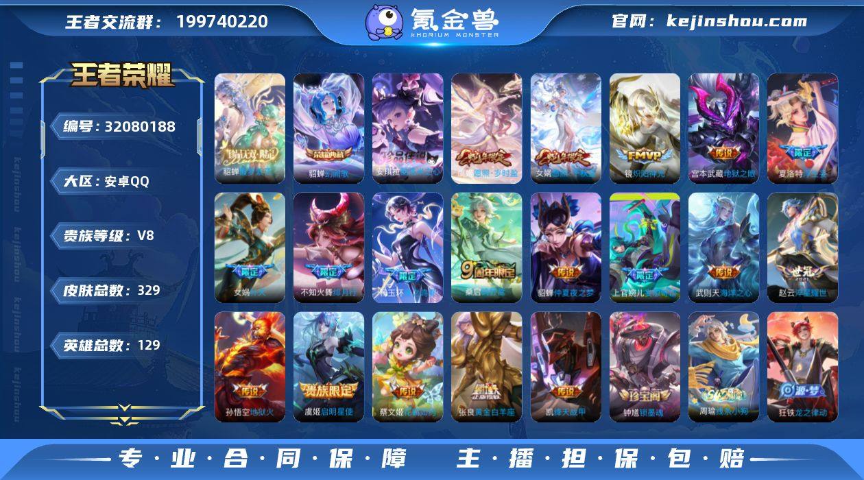 贵族等级:V8 典藏皮肤数:1 珍品无双皮肤数:1 无双皮肤数:0 珍品传说皮肤数:1 传说皮肤数:18 史诗皮肤数:99 皮肤数:329 英雄数:129 段位:钻石 卖家说:18传说,两个荣耀水晶皮肤,1个荣耀水晶英雄,1个珍品无双,一个珍品传说,上官神器皮肤,极品女号