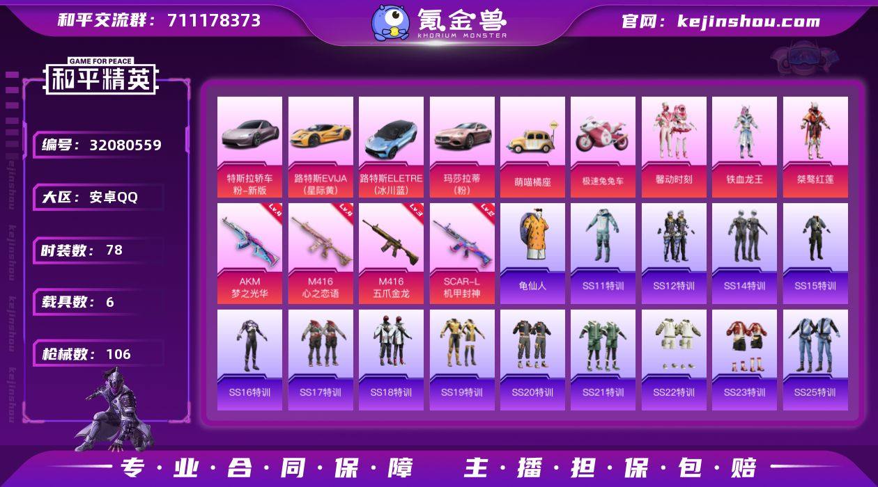 安卓 手Q-3粉装-4特效枪-6载具-0粉色飞行器-40149热力值-5王牌印记-78套装-106枪皮 【热门品类】:套装-龟仙人 【粉色套装】:粉装-馨动时刻,粉装-铁血龙王,粉装-桀骜红莲 【粉色枪皮等级】:AKM-梦之光华(四级),SCAR-L-机甲封神(二级),M416-五爪金龙(三级),M416-心之恋语(四级) 【粉色载具】:特斯拉Roadster(沁心粉),路特斯EVIJA(星际黄),路特斯ELETRE(冰川蓝),玛莎拉蒂Ghibli(粉),萌喵橘座,极速兔兔车 【粉色枪皮】:AKM-梦之光华,SCAR-L-机甲封神,M416-五爪金龙,M416-心之恋语 【粉色降落伞】:四圣焕新降落伞,星之彼岸降落伞,机甲封神降落伞 【稀有套装】:套装-龟仙人 【稀有枪皮】:AKM-四圣焕新,AKM-彩虹符号,AKM-灼热熔岩,AKM-破晓战魂,AKM-萌趣颜团子,AKM-虎虎生威,AKM-龙的传人,M16A4-夜灯,M16A4-幻世战舞者,M16A4-机械英豪,SCAR-L-玉兔迎春,SCAR-L-红色方程式,M416-葫芦兄弟,GROZA-彩虹符号,AUG-天降萌叽,AUG-青春冒险家,QBZ-原初圣火,QBZ-彩虹符号,M762-天降萌叽,M762-牛气冲天,M762-绯红前夜,Mk47-青春冒险家,G36C-时空追击者,AC-VAL-天降萌叽,蜜獾-天降萌叽,UZI-啾咪啾咪,UZI-天降萌叽,UZI-烈焰拳霸,UMP45-时空追击者,UMP45-生命誓言,UMP45-蓝色火焰,Vector-夜灯,Vector-彩虹符号,Vector-枪炮玫瑰,Vector-生命誓言,汤姆逊-天降萌叽,汤姆逊-耀粉歌者,野牛-夜灯,野牛-机械英豪,野牛-青春冒险家,Kar98K-彩虹符号,Kar98K-欢乐麻酱,Kar98K-炫彩节奏,Kar98K-王子的夏天,M24-炫彩节奏,SKS-时空追击者,SKS-炫彩节奏,Mini14-原初圣火,Mini14-穿刺龙虾,Win94-机械英豪,SLR-四圣焕新,SLR-彩虹符号,QBU-烈焰拳霸,QBU-青春冒险家,S686-彩虹符号,S686-生命誓言,S1897-春暖花开,S1897-炫彩节奏,S12K-玩趣呆呆,S12K-破晓战魂,...