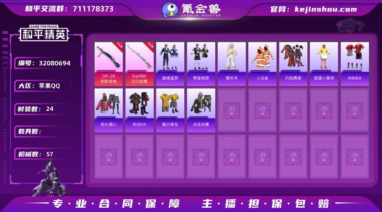 苹果 手Q-0粉装-3特效枪-0载具-1粉色飞行器-13283热力值-0王牌印记-24套装-57枪皮【热门品类】:套装-小丑鱼【粉色枪皮等级】:Kar98K-巳巳如意(五级),Mk14-福马献瑞(五级),DP-28-豹影疾电(五级)【粉色枪皮】:Kar98K-巳巳如意,Mk14-福马献瑞,DP-28-豹影疾电【粉色飞行器】:炫彩糖果飞行器【粉色降落伞】:星之彼岸降落伞,炫彩糖果降落伞【稀有套装】:套装-雪国风尚,套装-炫彩糖果,套装-马上来财,玩偶服-懒羊羊,套装-画境星梦,套装-琴音绮想,角色-馥郁金蕊【稀有枪皮】:AUG-冰晶雪宝,M16A4-幻世战舞者,M16A4-红色方程式,SCAR-L-炫彩节奏,SCAR-L-玉兔迎春,M416-蓝色火焰,GROZA-影袭,M762-彩虹符号,ACE32-画境星梦,UZI-啾咪啾咪,UMP45-生命誓言,UMP45-极意拳锋,汤姆逊-天降萌叽,MP5K-画境星梦,M1加兰德-画境星梦,S1897-炫彩节奏,AA12-G-画境星梦,MG3-幻世战舞者,短管霰弹-星穹咏叹调,蝎式手枪-虹云熊熊,平底锅-画境星梦【其他套装】:套装-灼焰舞者,套装-破蛋小黄鸡,套装-绯格组合,套装-街头潮人,套装-青涩时光,套装-魅力单车,套装-冰冻风暴【营地ID】:1032374580
