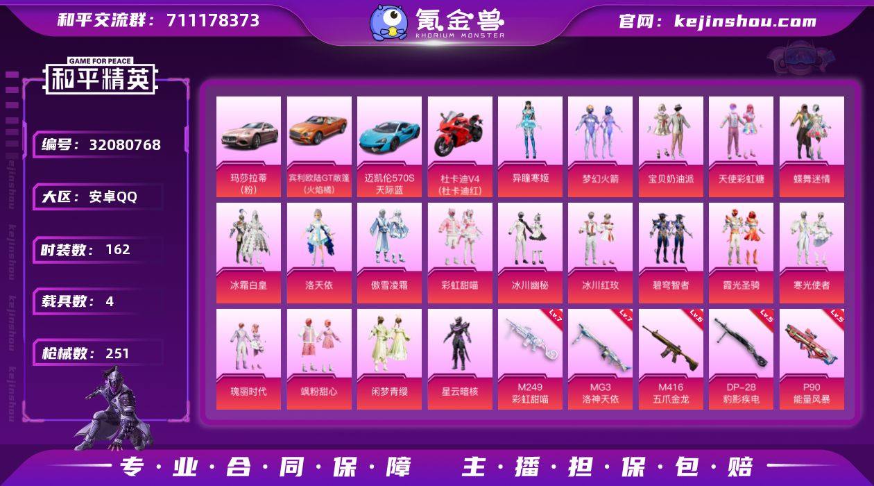 安卓 手Q-18粉装-8特效枪-4载具-3粉色飞行器-81494热力值-10王牌印记-162套装-251枪皮 【热门品类】:粉装-梦幻火箭,套装-龟仙人,套装-暗影哥特,套装-粉红小猪 【粉色套装】:粉装-宝贝奶油派,粉装-天使彩虹糖,粉装-蝶舞迷情,粉装-梦幻火箭,粉装-冰霜白皇,角色-洛天依,粉装-傲雪凌霜,粉装-彩虹甜喵,粉装-冰川幽秘,粉装-冰川红玫,粉装-碧穹智者,粉装-霞光圣骑,粉装-寒光使者,粉装-瑰丽时代,粉装-飒粉甜心,粉装-闲梦青缨,角色-星云暗核,角色-异瞳寒姬 【粉色枪皮等级】:SCAR-L-童趣迷兔(四级),M416-五爪金龙(六级),汤姆逊-冰川粉黛(四级),P90-能量风暴(五级),Kar98K-巳巳如意(五级),M249-彩虹甜喵(七级),DP-28-豹影疾电(五级),MG3-洛神天依(七级) 【粉色载具】:玛莎拉蒂Ghibli(粉),宾利欧陆GT敞篷(火焰橘),迈凯伦570S(天际蓝),杜卡迪 Panigale V4(杜卡迪红) 【粉色枪皮】:SCAR-L-童趣迷兔,M416-五爪金龙,汤姆逊-冰川粉黛,P90-能量风暴,Kar98K-巳巳如意,M249-彩虹甜喵,DP-28-豹影疾电,MG3-洛神天依 【粉色飞行器】:炫彩糖果飞行器,梦幻火箭飞行器,万古烈焰飞行器 【粉色降落伞】:甜心宝贝降落伞,梦幻火箭降落伞,繁花小夜曲降落伞,马卡龙降落伞,银刃赛罗降落伞,童趣迷兔降落伞,香水柠檬降落伞,洛神天依降落伞,海渊国主降落伞,蓝莓炮弹降落伞,垂柳戏鸭降落伞,彩虹甜喵降落伞,旋转彩虹降落伞,冰川粉黛降落伞,飒粉甜心降落伞,未来歌姬降落伞,闲梦青缨降落伞,万古烈焰降落伞,鬼刀降落伞,绯穹魔姬降落伞,炫彩糖果降落伞 【稀有套装】:套装-龟仙人,套装-巳巳如意,套装-炫彩糖果,套装-霓虹热舞 【稀有枪皮】:AKM-2P战斗服款,AKM-夜灯,AKM-彩虹符号,AKM-灼热熔岩,AKM-生命誓言,AKM-虎虎生威,AKM-霓虹街区,AKM-龙的传人,M16A4-幻世战舞...