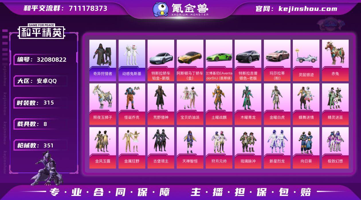 安卓 手Q-39粉装-14特效枪-8载具-5粉色飞行器-153881热力值-16王牌印记-315套装-351枪皮 【热门品类】:粉装-怪诞乔克,套装-浪漫天命,套装-奇异狩猎者,套装-动感兔斯基人偶服,角色-忠猛周仓,角色-忠真马岱,角色-忠义严颜,套装-六号树人,套装-龟仙人,套装-潮萌小黄鸭,套装-暗影哥特,套装-粉红小猪,套装-萌熊伴侣,角色-8号机,角色-Mark.06,大砍刀-青龙偃月刀,撬棍-龙胆亮银枪 【粉色套装】:粉装-荒野猎神,粉装-怪诞乔克,粉装-宝贝奶油派,粉装-土曜战麒,粉装-木曜青龙,粉装-金曜白虎,粉装-蝶舞迷情,粉装-精灵迷巫,粉装-金风玉露,粉装-金属狂野,粉装-古堡领主,粉装-天禅智恒,粉装-狩月元帅,粉装-琉璃脉冲,粉装-新星烈龙,粉装-向日葵,粉装-极致幻想,粉装-扶摇飞仙,粉装-幻彩马卡龙,粉装-银刃赛罗,粉装-炙焰红王,粉装-绮梦青鸾,粉装-甜梦冰蝶,粉装-馨动时刻,粉装-虎啸骄阳,粉装-炙焰赤龙,粉装-飓风飞鹰,粉装-银龙傲海,粉装-骨龙祭渊,粉装-恐龙拽拽,角色-茉莉星,角色-水仙星,粉装-莲影清波,粉装-傲傲奶龙,角色-熔岩统帅,角色-冰炎战车,角色-紫钛骑兵,角色-初号机 觉醒Ver.,粉装-金丰海韵 【粉色枪皮等级】:AKM-炫紫旋律(五级),SCAR-L-机甲封神(五级),M416-五爪金龙(七级),GROZA-镜光银凌(五级),AUG-暖羊咩咩(五级),M762-甜蜜誓约(七级),Famas-初号机 觉醒Ver.(四级),UMP45-相思残雪(七级),P90-金丰海韵(五级),Kar98K-伏魔团(五级),Kar98K-巳巳如意(五级),MG3-突变脉冲(五级) 【粉色载具】:特斯拉Model X(冷光银),特斯拉Roadster(尊享铂),兰博基尼Aventador SVJ(翡翠绿),阿斯顿马丁DBS(金),玛莎拉蒂Ghibli(粉),灵鼠银迹,空客H135-蔚蓝之翼,赤兔,照夜玉狮子 【粉色枪皮】:AKM-炫紫旋律,SCAR-L-机甲封神,M416-五爪金龙,GROZA-镜...
