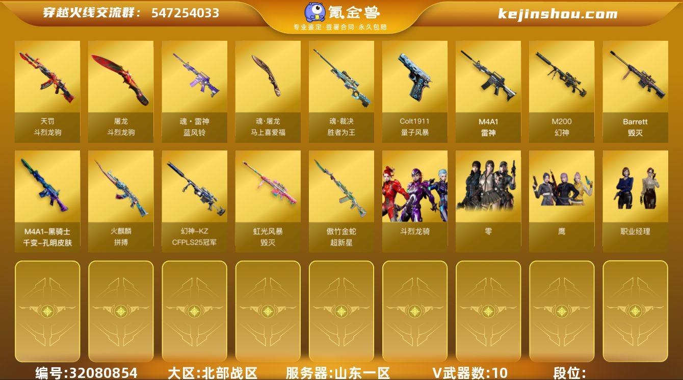 实名: 不可修改 V武器: M4A1-雷神,Barrett-毁灭,M200-幻神,魂·裁决-胜者为王,屠龙-斗烈龙驹,天罚-斗烈龙驹,Colt1911-量子风暴,魂·屠龙-马上喜爱福,魂・雷神-蓝风铃 热门武器: 猫猫手套 狙击枪稀有皮肤: 毁灭-虹光风暴,幻神-KZ-CFPLS25冠军 英雄角色: 零,鹰,职业经理,斗烈龙骑,团团 音效道具: Barrett-毁灭音效卡,M200-幻神音效卡